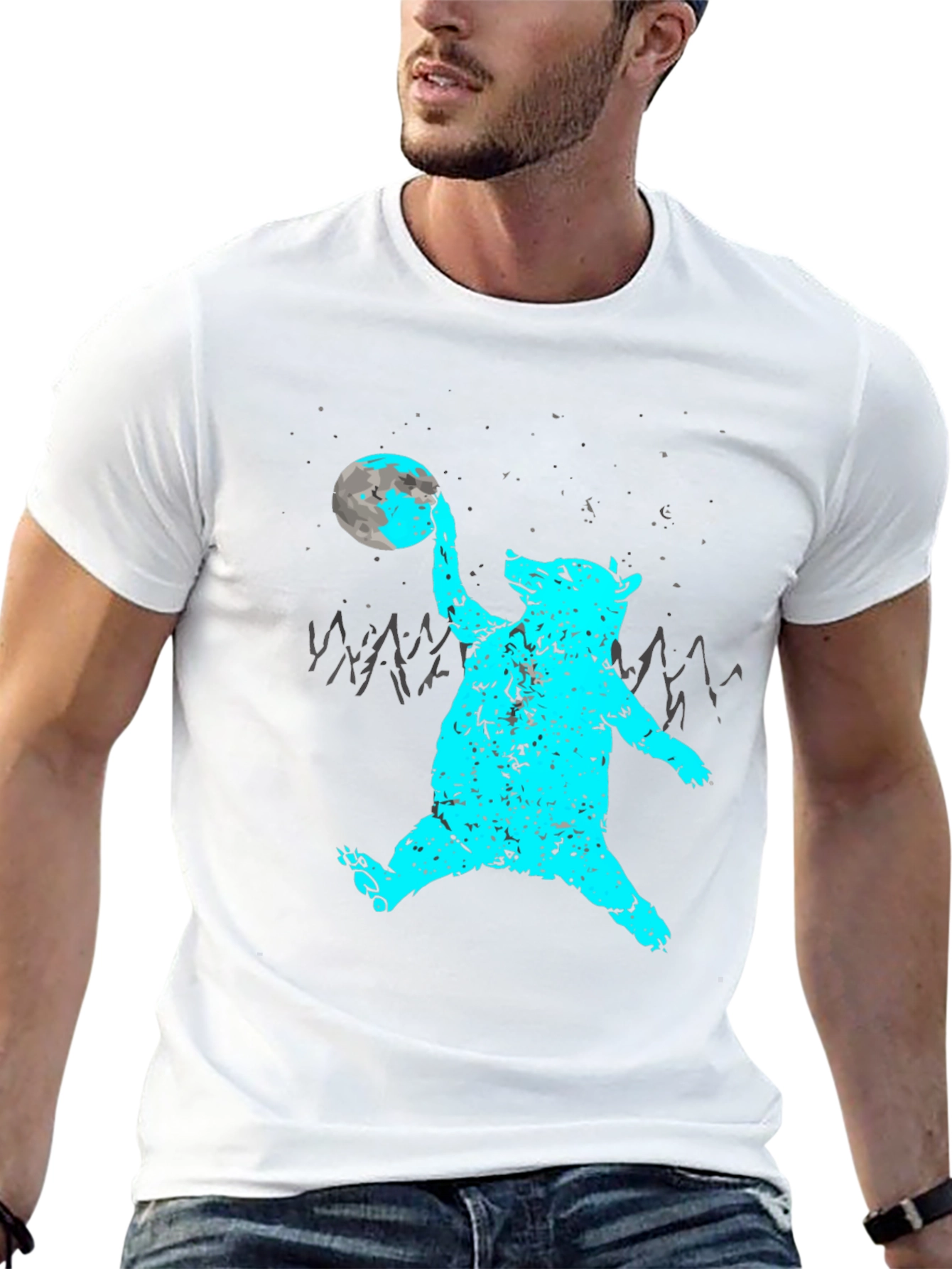 Show off your love for the cosmos and cool graphics with this unique bear t-shirt. Featuring a stylized graphic of a turquoise bear holding the moon with gray mountains in the backdrop, this tee is sure to turn heads. The black shirt offers a classic look. Made from comfortable materials. Great for casual wear or as a statement piece. Ideal for anyone looking to add some fun and unique style to their wardrobe.