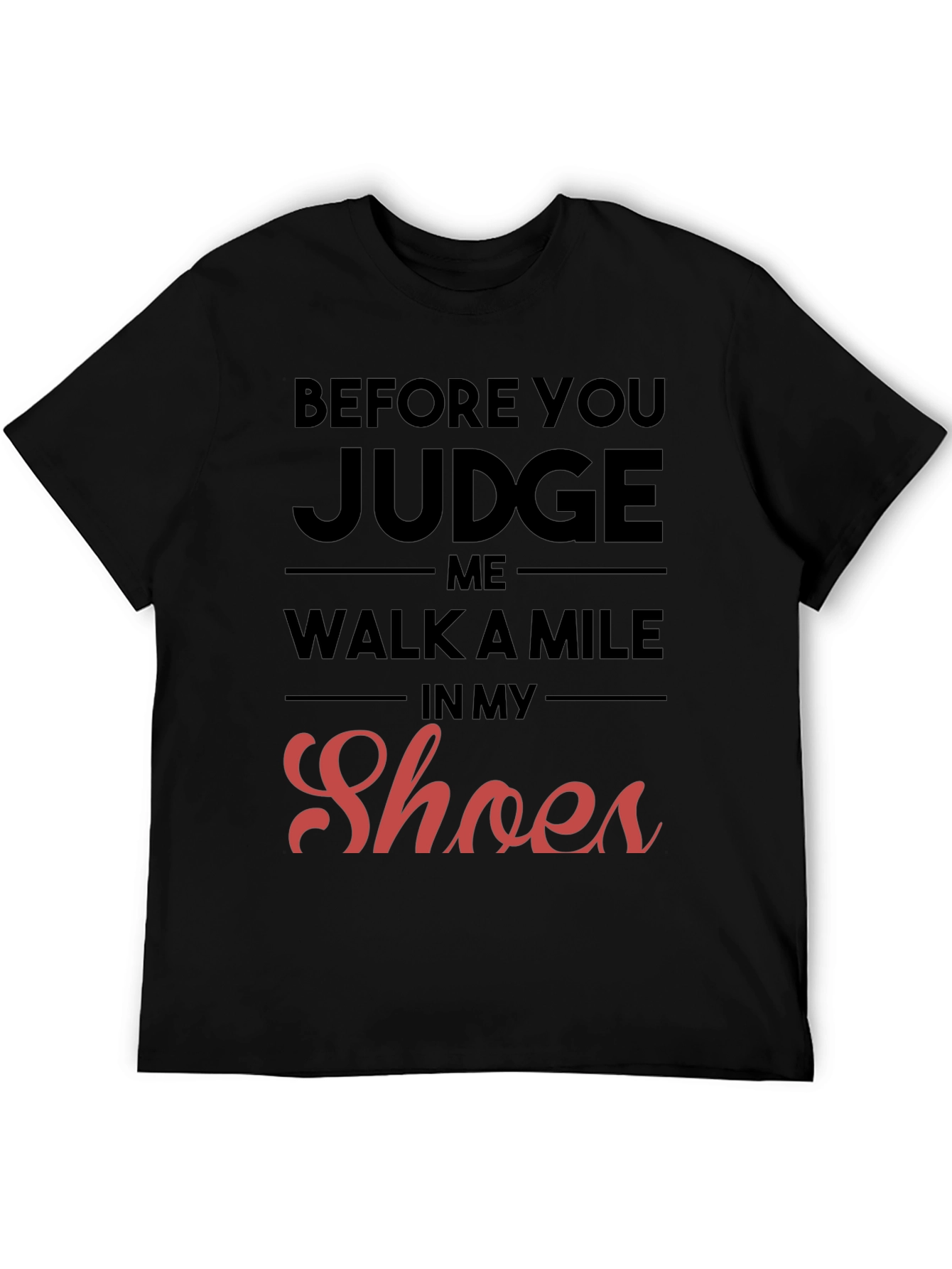 This t-shirt makes a statement with its bold text design. The shirt features the phrase "Before You Judge Me Walk A Mile In My Shoes" printed in a combination of black and red fonts. This classic fit tee can be paired with jeans, shorts, or joggers for a casual, everyday look. Its unique design is sure to make a statement wherever you go. This shirt is perfect for making a statement or a thoughtful gift for someone special.