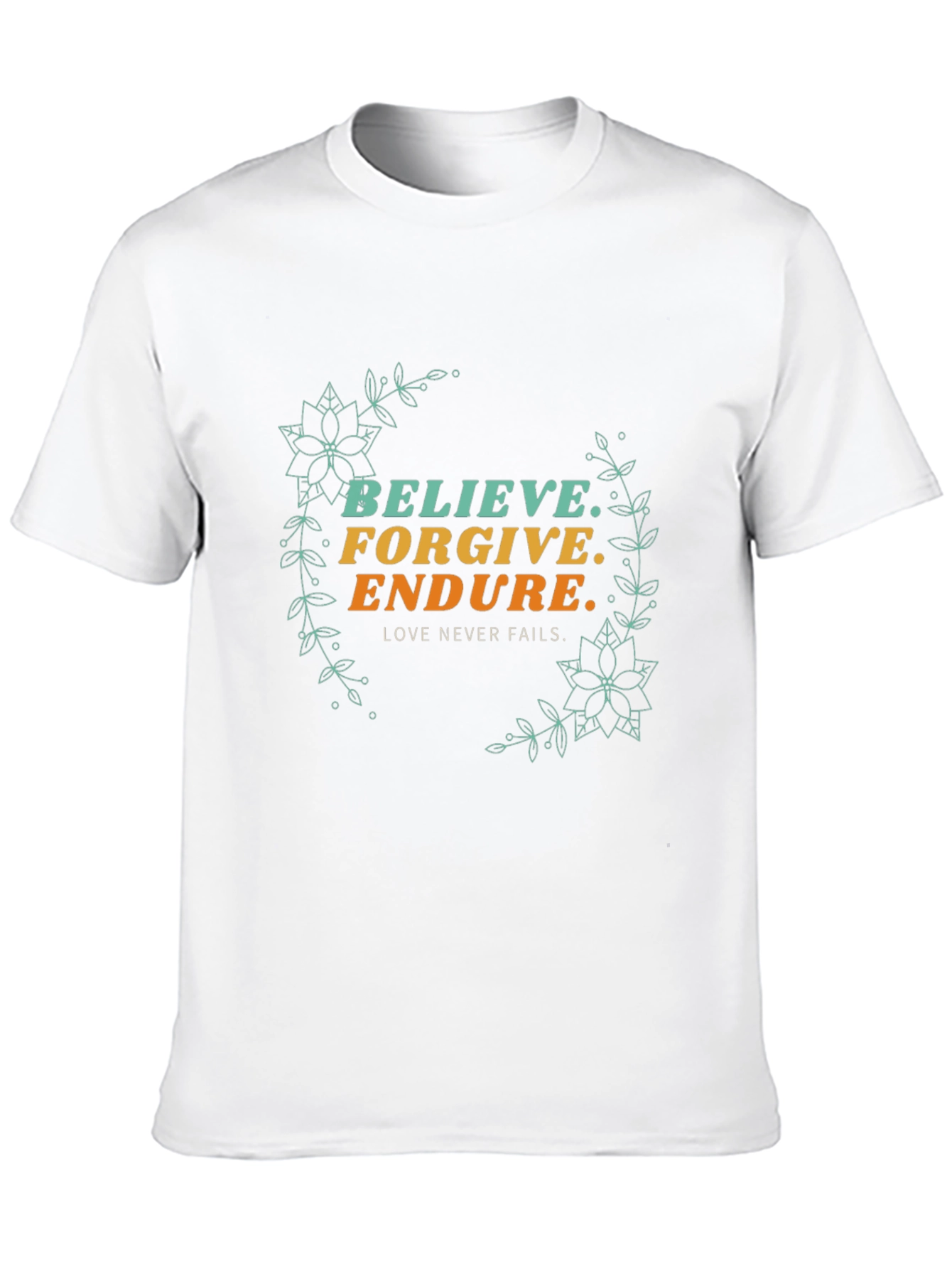 Express your values with this inspiring graphic tee. The design features the words "Believe, Forgive, Endure" surrounded by delicate floral accents. The message and imagery are printed on a soft, breathable black fabric. This t-shirt offers a comfortable fit for everyday wear. Ideal for casual outings, workouts, or simply relaxing at home. This tee serves as a reminder of the power of faith, forgiveness, and perseverance. A great gift option for loved ones who value positivity and personal growth.
