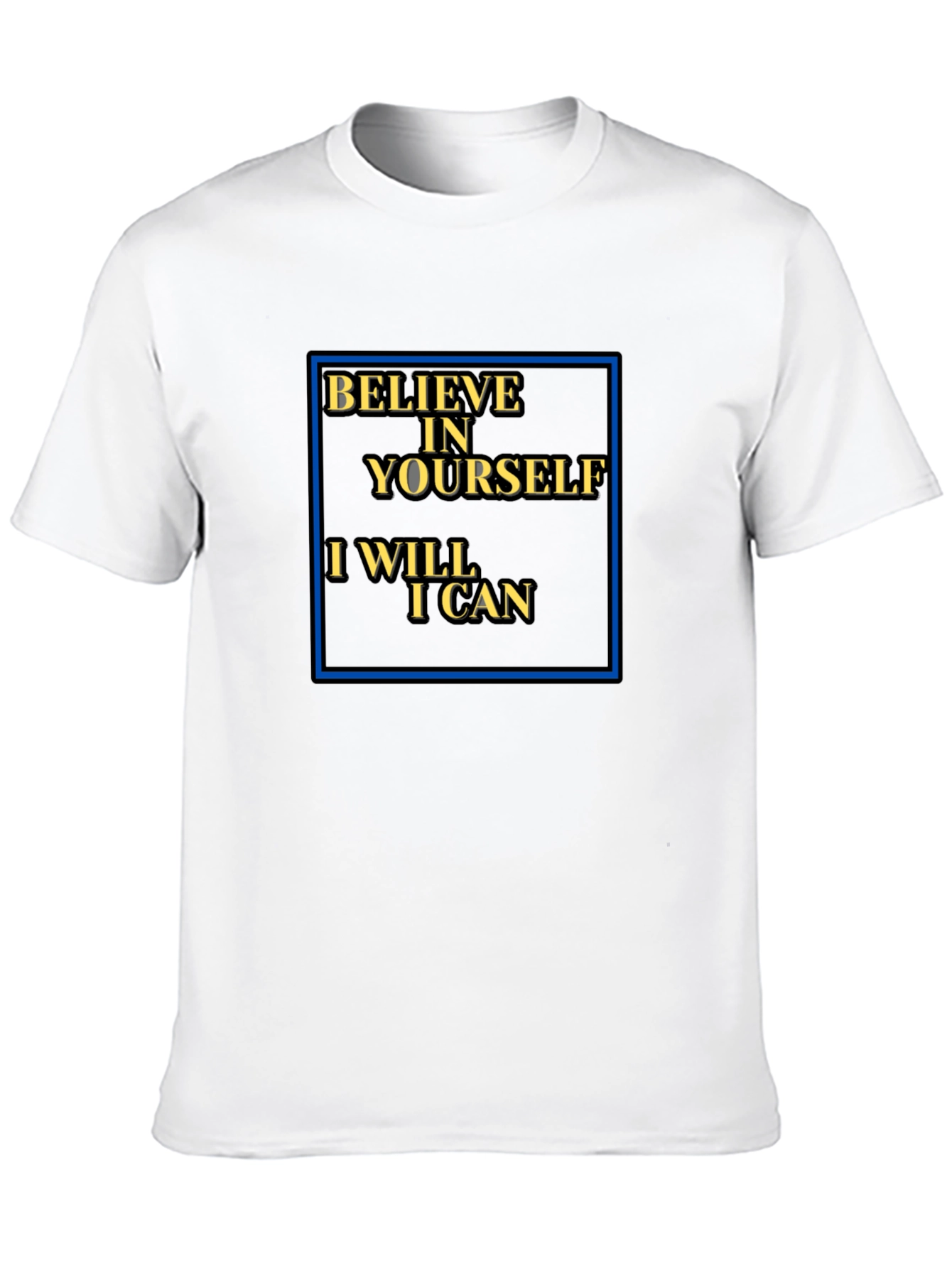 This black t-shirt features a bold, inspirational message: "BELIEVE IN YOURSELF I WILL I CAN." The text is rendered in an eye-catching gold color with a blue rectangular border. Made from soft, breathable fabric, this tee offers both comfort and style. The classic fit makes it suitable for everyday wear, whether you're hitting the gym, running errands, or just lounging at home. The motivational message adds a touch of positivity to your wardrobe. This shirt is perfect for anyone seeking a daily reminder to stay confident and pursue their goals with unwavering determination. Spread good vibes wherever you go!