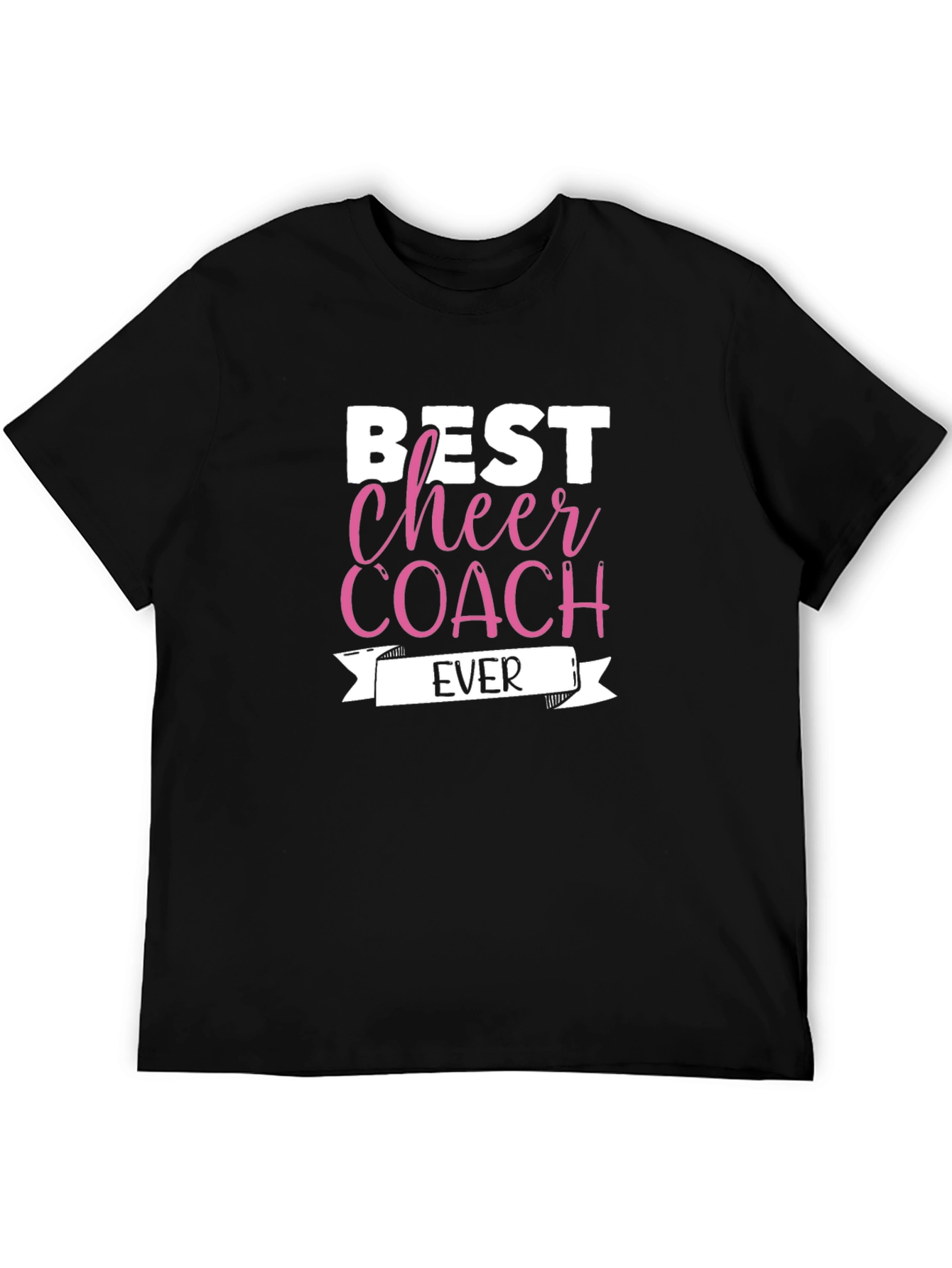 Show your appreciation with this "Best Cheer Coach Ever" t-shirt. This black tee features a bold, eye-catching design with white text for "BEST" and "EVER" and a vibrant pink cursive font for "cheer COACH". The slogan is presented on a banner across the shirt's chest. Made from soft, breathable fabric, this shirt offers all-day comfort, ideal for coaches at practice, cheer events, or casual wear. The classic fit makes it a versatile addition to any wardrobe. This t-shirt makes a thoughtful gift for the cheerleading coach who goes above and beyond.