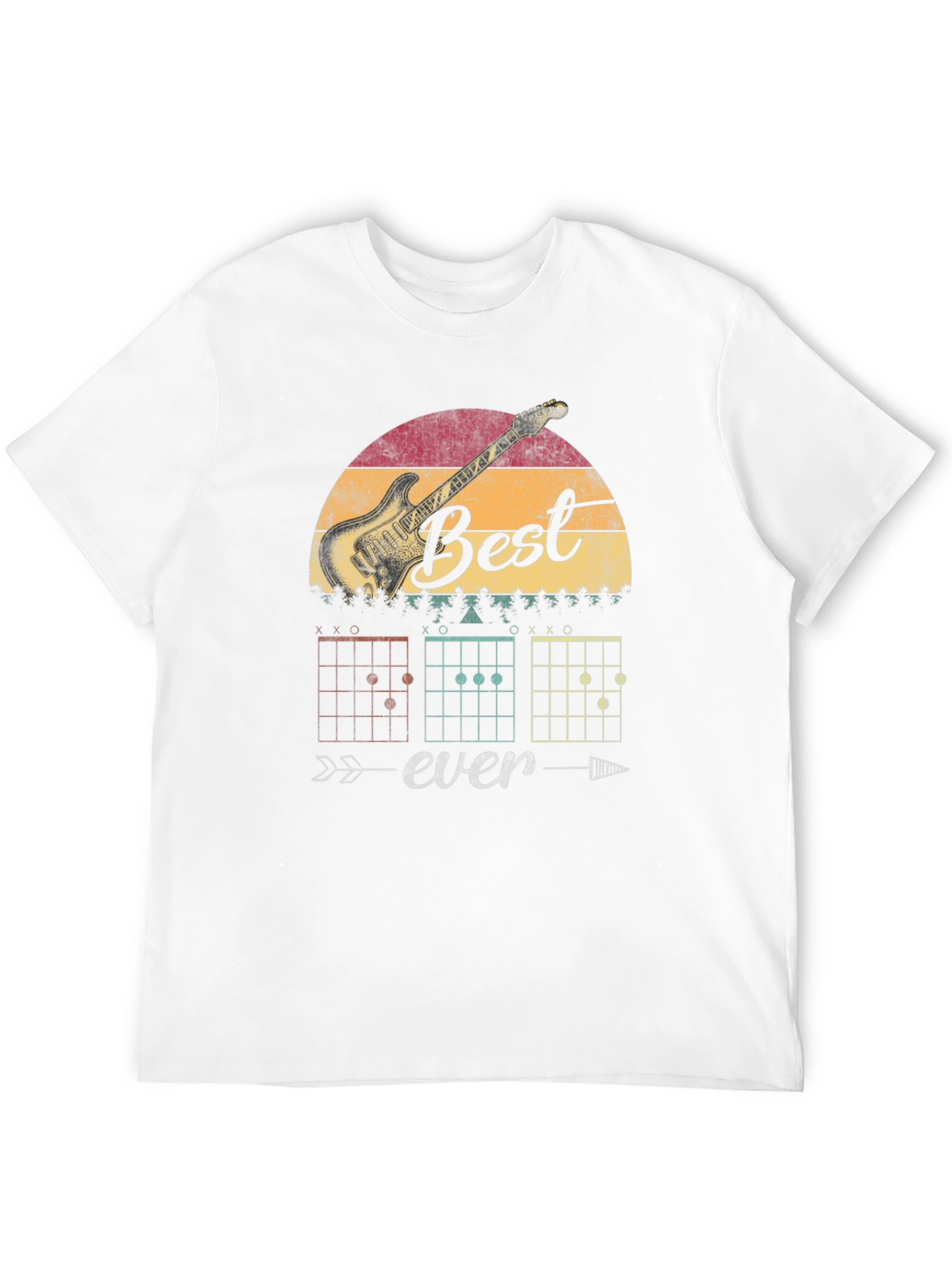Show off your love for guitar with this stylish black tee. The design features a vintage-inspired graphic with a guitar silhouette set against a sunset backdrop. Below are chord diagrams, adding a touch of musical authenticity. "Best ever" is printed on the shirt. The comfortable material makes it ideal for everyday wear, whether you're jamming with friends, hitting up a concert, or just relaxing at home. Makes a great gift for the guitar enthusiast in your life.