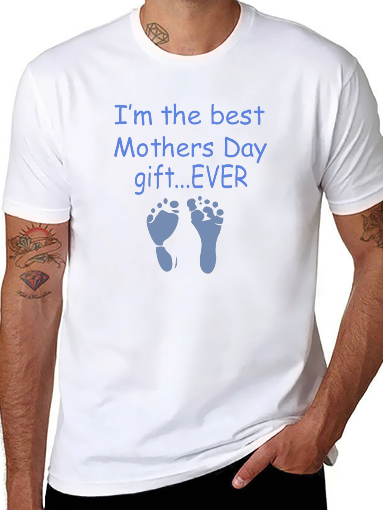 Celebrate Mother's Day with this unique and heartfelt T-shirt! Made from a comfortable, dark-colored fabric, this tee features a light blue playful design that reads "I'm the best Mothers Day gift...EVER" accompanied by adorable baby footprints. This is a perfect way for new dads or kids to show their love and appreciation for mom. The relaxed fit makes it ideal for everyday wear, whether she's running errands or relaxing at home. Give the gift of laughter and love with this memorable T-shirt that's sure to bring a smile to her face this Mother's Day. It's not just a shirt; it's a statement!