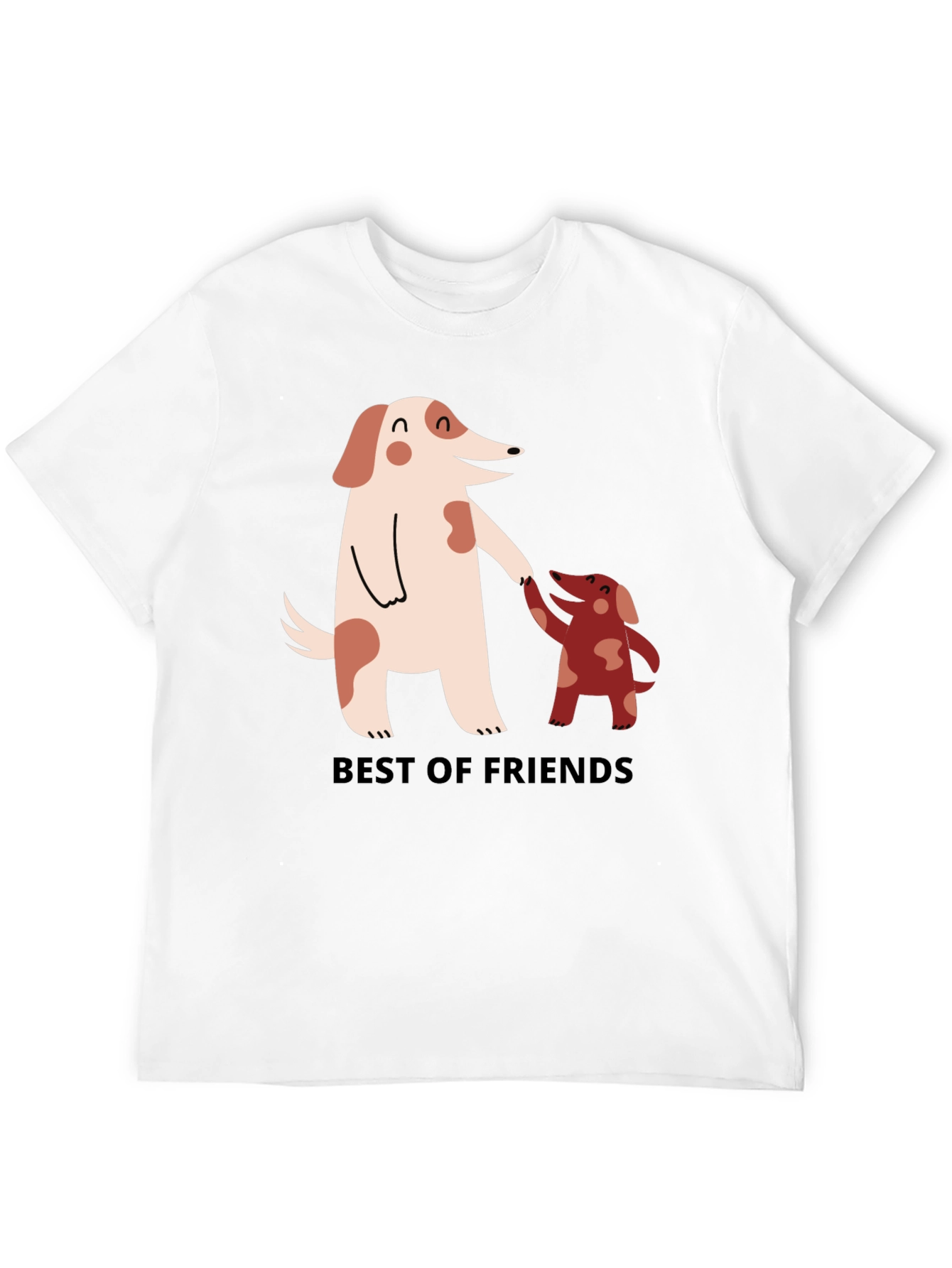 Show your love for your furry friends with this adorable t-shirt. Made from a comfortable, breathable fabric, this black tee features a charming cartoon graphic of two dogs. The larger, light-colored dog appears to be holding hands with the smaller, red-brown dog. The words "BEST OF FRIENDS" are printed beneath the image, expressing the loving message of the design. This shirt is perfect for dog lovers who want to show off their passion in a fun, stylish way. Great for casual wear, walks in the park, or just lounging around the house with your best canine pal.