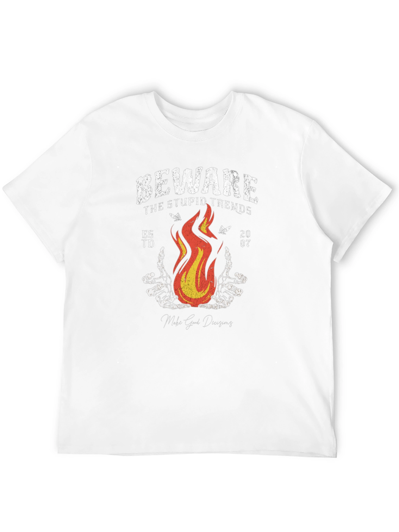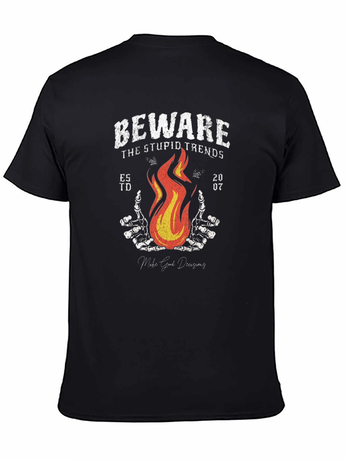 This black t-shirt features a distressed graphic print with the words "Beware the Stupid Trends." The design includes an image of stylized flames and skeletal hands, with "Est. TD 2007" flanking the central graphic. The shirt has a classic crew neck and short sleeves, suitable for casual wear. The cotton material suggests comfort and breathability, making it ideal for everyday use. This statement tee adds an edgy vibe to any outfit, perfect for expressing individuality.