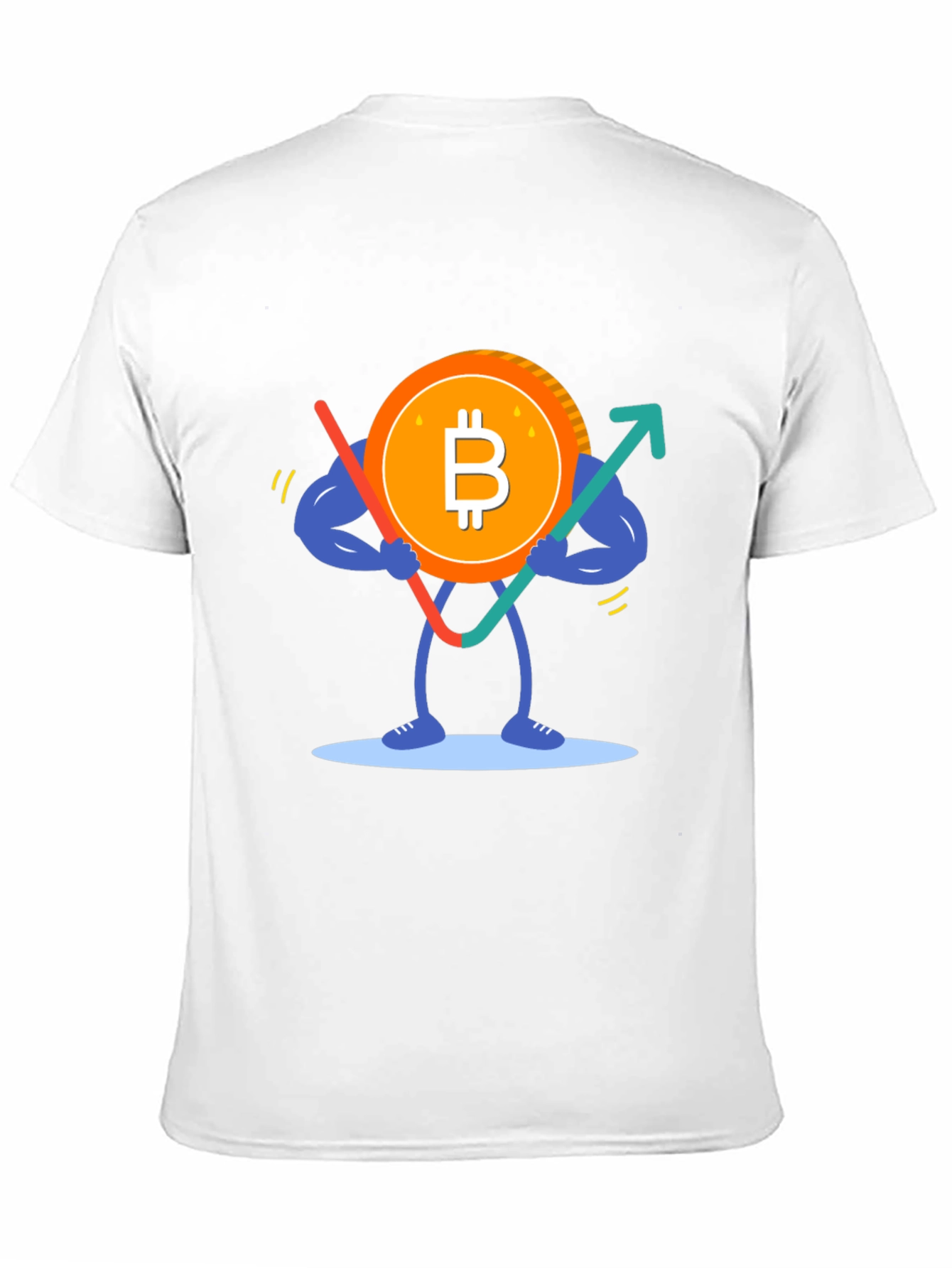 Show your enthusiasm for cryptocurrency with this eye-catching black t-shirt! The design features a cartoon Bitcoin character, illustrated as a strong figure, holding up and between an up-trending green and a down trending red graph. This unique design makes it a perfect conversation starter and a fun way to express your interest in digital currency. Made from soft, comfortable fabric, this t-shirt is ideal for casual wear or any crypto-themed event. Get yours today and let everyone know you're part of the Bitcoin revolution!