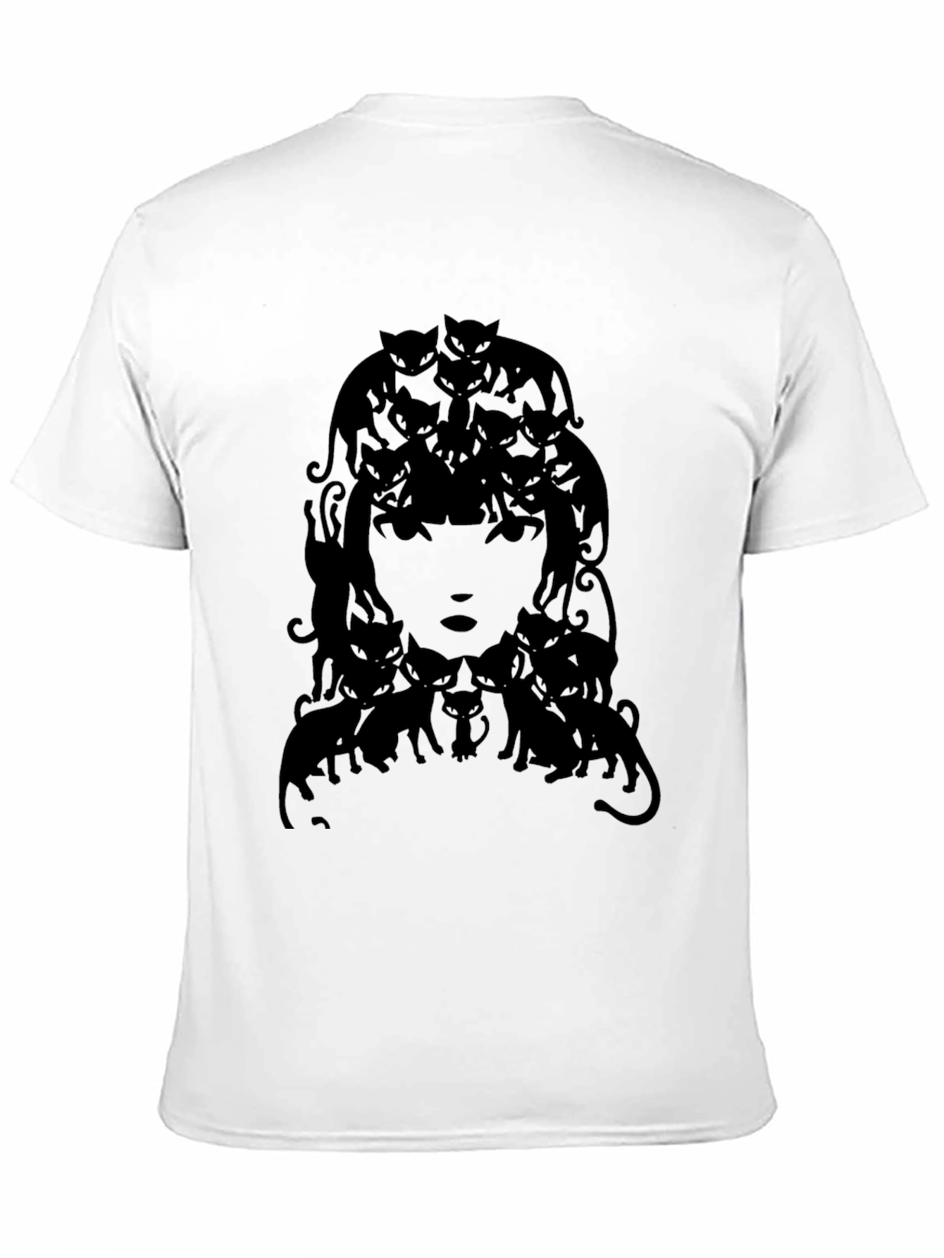 Show off your unique style with this eye-catching black t-shirt. The shirt features a creative graphic of a woman with cats forming her hair and surrounding her face, creating a whimsical and slightly gothic vibe. Made from what appears to be a comfortable, soft fabric, this unisex tee is perfect for casual wear. The design is bold and striking, making it a great conversation starter. Ideal for cat lovers, those who appreciate unusual art, or anyone looking to add a touch of individuality to their wardrobe. Wear it out with jeans, to a casual event, or simply relax at home in style.