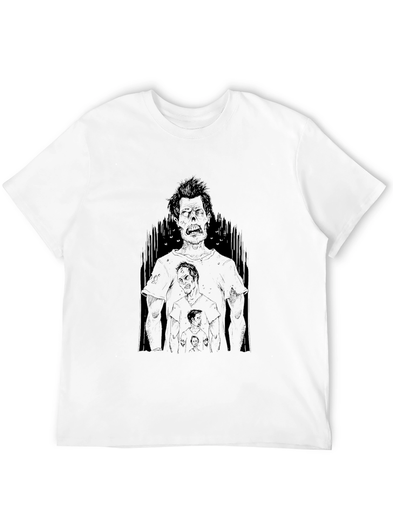 Unleash your inner horror fan with this striking black t-shirt. The shirt features a unique recursive design depicting a zombie figure. The design appears to be drawn in a stylized black and grey ink, adding a touch of edgy artistry to the piece. Made from a comfortable-looking fabric, this tee is perfect for casual wear, horror movie nights, or making a statement wherever you go. Show off your unique style with this head-turning graphic tee.