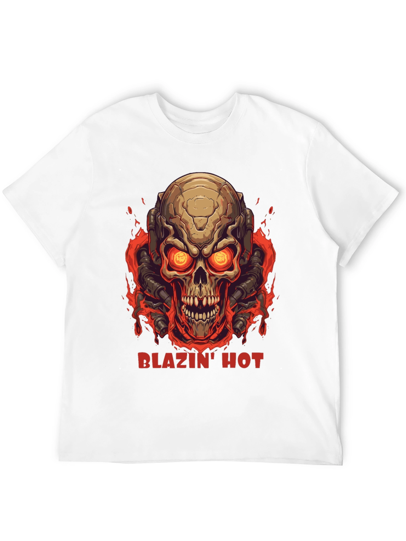 Ignite your style with this bold black t-shirt featuring a 'Blazin' Hot' skull graphic! The design showcases a detailed, futuristic skull with glowing red eyes, surrounded by fiery accents and mechanical elements. Made from a soft, breathable fabric, this tee offers both comfort and standout appeal. Ideal for casual wear, concerts, or making a statement wherever you go. Pair it with jeans or shorts for an effortlessly cool look. Perfect for those who love edgy, eye-catching apparel. Get ready to turn heads with this unique and fiery design!