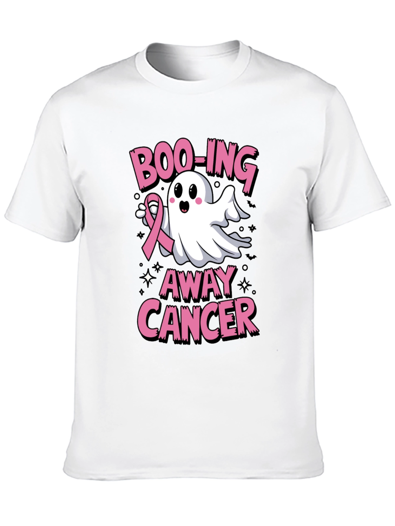 Show your support with this unique "Boo-ing Away Cancer" t-shirt. This black tee features a cute ghost graphic holding a pink ribbon. The playful design spreads awareness while adding a touch of fun. Made from comfortable fabric, it's perfect for everyday wear or cancer awareness events. A great conversation starter for raising awareness and showing your support for breast cancer research. Get yours today and make a statement!