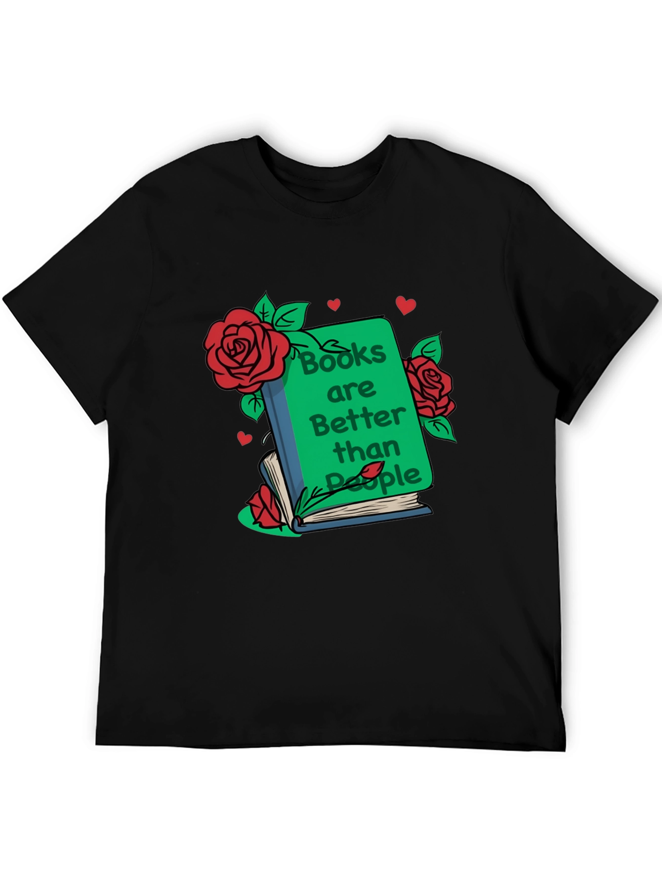 Express your love for reading with this unique graphic tee! The black t-shirt features a vibrant design of a green book surrounded by red roses and hearts. The book cover playfully states, "Books are Better than People." Perfect for bookworms and introverts, this comfortable shirt is ideal for wearing to the library, bookstore, book club meetings, or simply while curling up with your favorite novel. Made from a soft, breathable fabric, it offers both style and comfort. Let the world know where your priorities lie with this eye-catching and humorous statement piece.