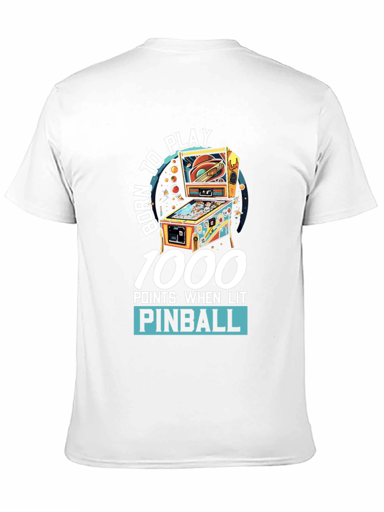 Show off your love for pinball with this eye-catching t-shirt! The design features a vibrant, detailed graphic of a classic pinball machine, surrounded by the words "Born to Play" and "1000 Points When Lit." The playful design is printed on a comfortable, black t-shirt, perfect for casual wear. This shirt is ideal for pinball enthusiasts, arcade lovers, or anyone who appreciates a touch of retro gaming style. Wear it to the arcade, a game night with friends, or just around town to express your passion for pinball. A fun and unique addition to any wardrobe.