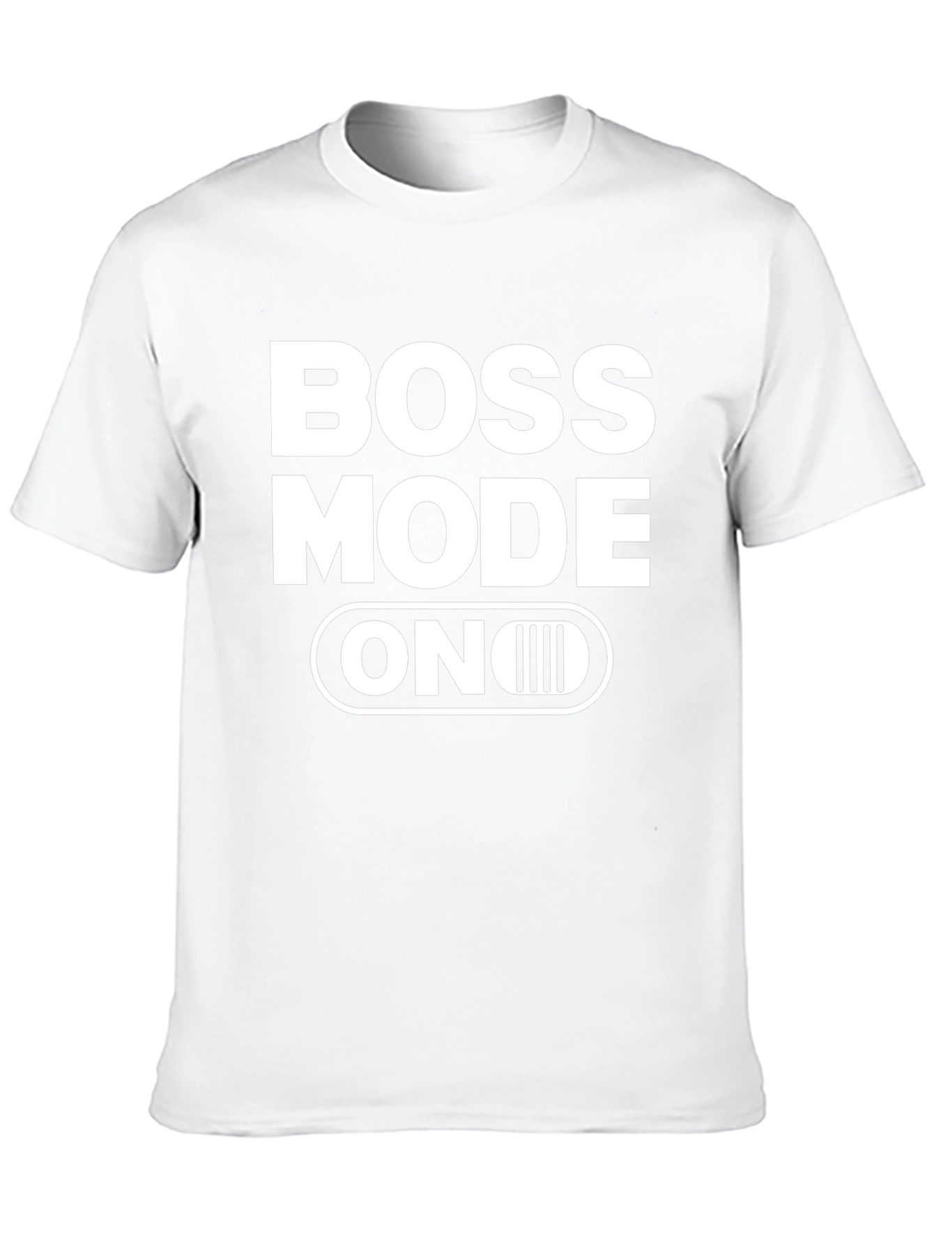 Command attention with this bold, black graphic tee. The shirt prominently features the phrase "BOSS MODE" in large, white block letters, followed by an "ON" graphic, making a clear statement of ambition and drive. Made from a soft-looking fabric, this short-sleeved t-shirt offers both comfort and style. Ideal for casual wear, workouts, or making a statement, this shirt is perfect for anyone ready to tackle the day in boss mode. Elevate your wardrobe with this standout piece and let your shirt do the talking.