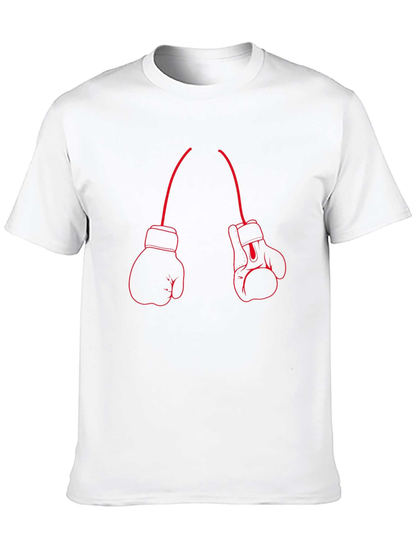 This black t-shirt features a striking graphic design of two boxing gloves outlined in red. The minimalist design makes a bold statement, perfect for boxing enthusiasts or anyone who appreciates unique apparel. The classic fit and comfortable fabric make it ideal for everyday wear. Show off your love for the sport with this eye-catching tee, whether you're hitting the gym or hanging out with friends. A perfect addition to any casual wardrobe. The simple yet powerful image is sure to turn heads.