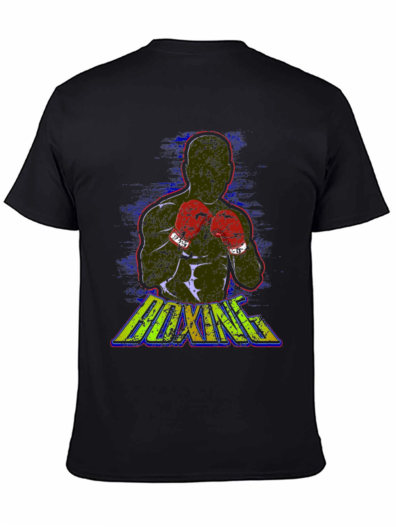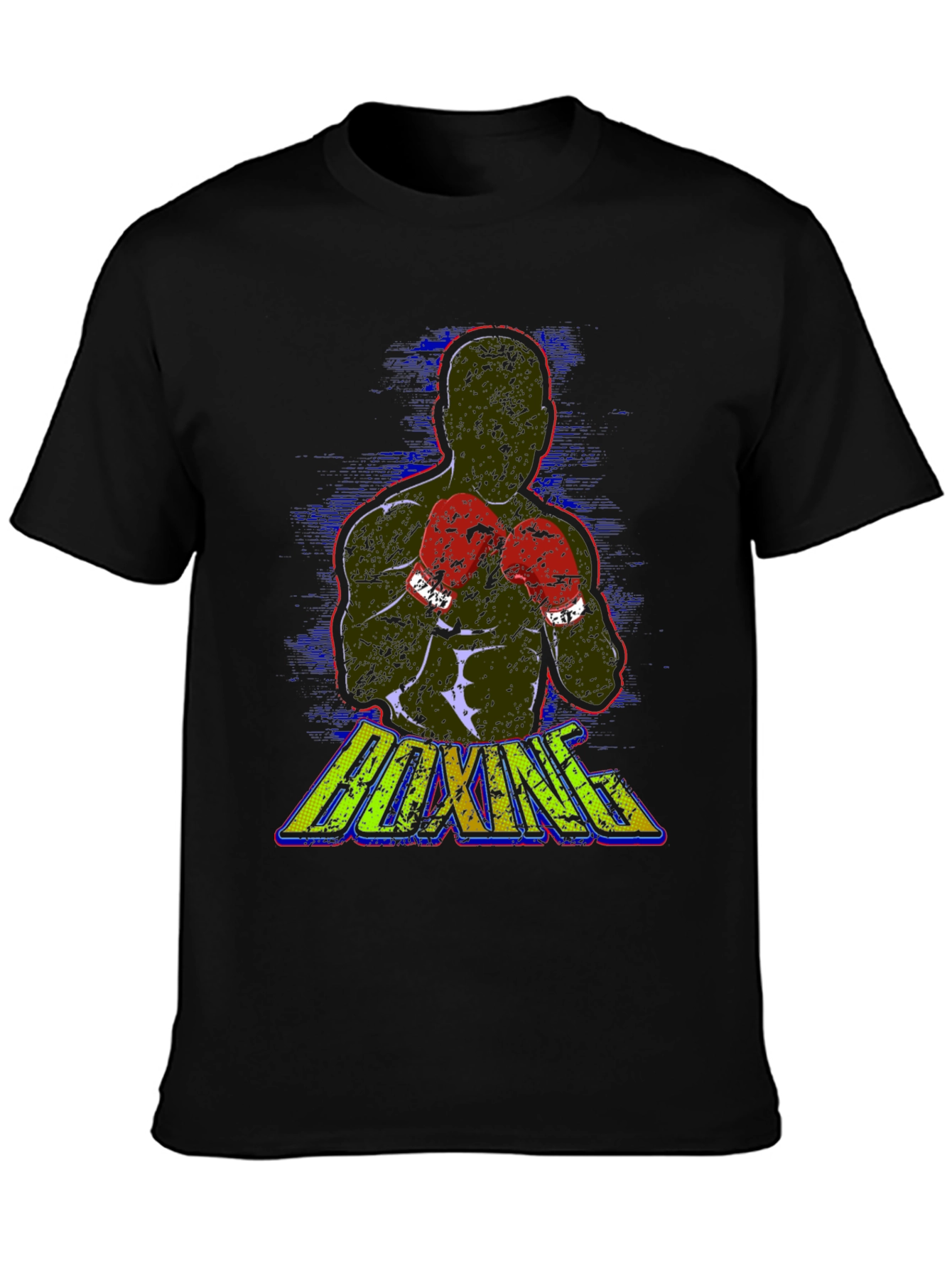 This stylish black t-shirt features a bold "BOXING" graphic print. The eye-catching design includes a silhouetted boxer with vibrant red gloves, set against a dynamic backdrop of blue and green accents. Made from soft, breathable fabric, this crew neck tee offers both comfort and style. Perfect for boxing enthusiasts, casual wear, or anyone looking to add a sporty edge to their wardrobe. Makes a great statement piece and conversation starter. Show off your love for the sport with this unique and comfortable graphic tee.