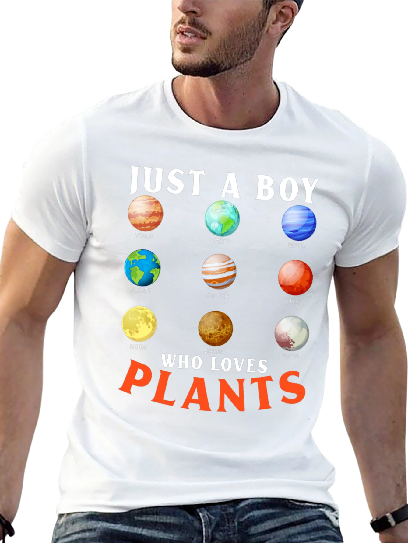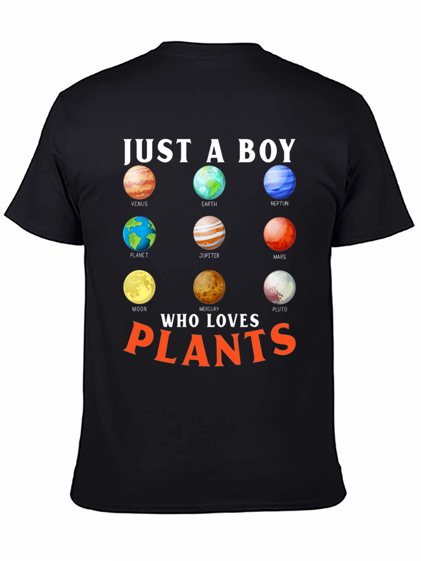 This unique black t-shirt features a playful design for boys who love both plants and planets. The shirt showcases vibrant, cartoon-style illustrations of planets like Venus, Earth, Neptune, Jupiter, Mars, and Pluto, along with our Moon, all arranged below the words "JUST A BOY". Below the planets, in bold orange lettering, are the words "WHO LOVES PLANTS." Made from a comfortable-looking fabric, this tee is perfect for casual wear. It's a great conversation starter and a fun way for kids to express their interests in space, science, and nature. Ideal for school, playdates, or any occasion where your little astronomer or botanist wants to shine.