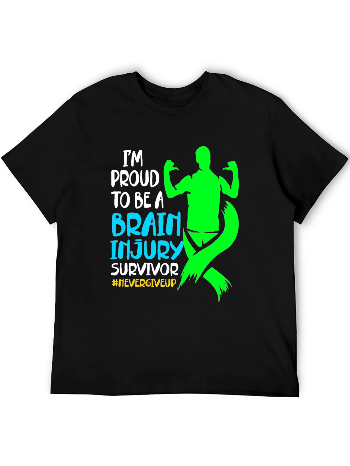 Show your support and raise awareness with this black Brain Injury Survivor T-shirt. The design features the words "I'M PROUD TO BE A BRAIN INJURY SURVIVOR" in white and blue lettering, next to a green silhouette and ribbon. Below the text is the hashtag #NEVERGIVEUP. Made from comfortable, breathable fabric, this tee is perfect for everyday wear, support events, or as a gift for brain injury survivors and advocates. The short sleeve design makes it suitable for a variety of casual occasions. A stylish way to show solidarity and strength.