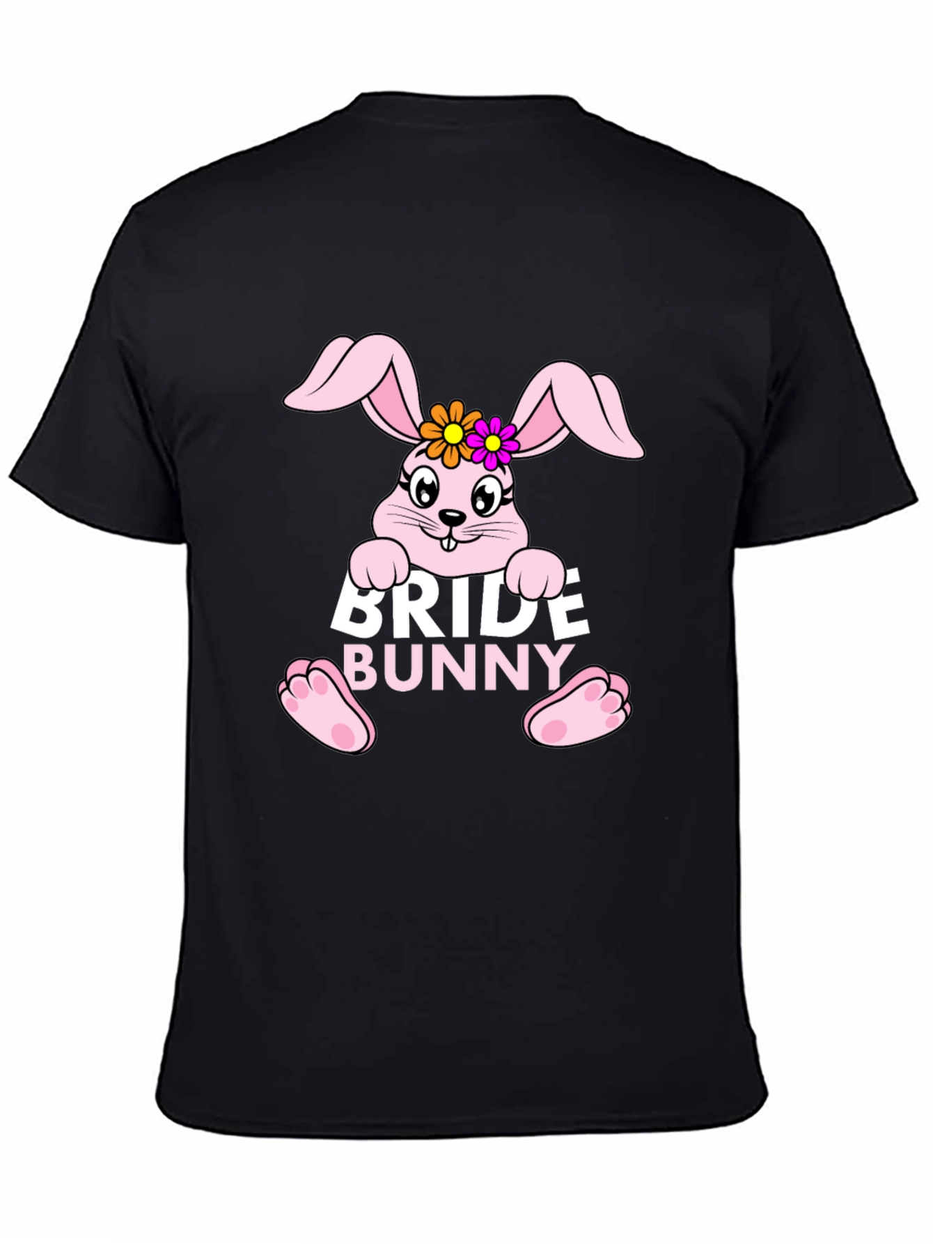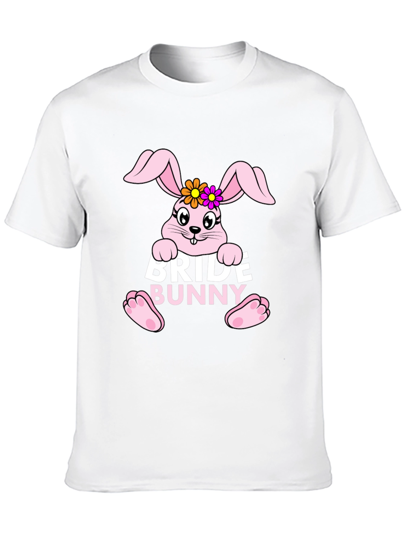 Celebrate your upcoming nuptials with this adorable Bride Bunny T-shirt! The black tee features a charming graphic of a pink bunny bride, complete with colorful flowers, pink feet, and the words 'Bride Bunny' in bold white font. Perfect for Easter hen parties, bridal showers, or just a fun and festive statement piece. The soft fabric ensures comfortable wear, while the eye-catching design guarantees you'll stand out from the crowd. Get ready to hop down the aisle in style with this unique and playful t-shirt!