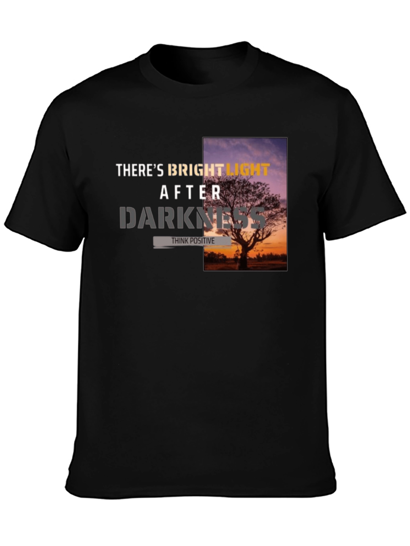 Embrace positivity with this stylish black graphic tee. The shirt features an inspiring design with the words "There's Bright Light After Darkness" printed on the front, complemented by a beautiful sunset and tree graphic. The phrase "Think Positive" adds a subtle yet powerful message. Made from comfortable material, this t-shirt is perfect for everyday wear. Whether you're looking to express your optimistic outlook or simply want a trendy addition to your wardrobe, this tee is an excellent choice. Pair it with jeans, shorts, or joggers for a casual yet fashionable look. This shirt is a great reminder to stay positive during challenging times.