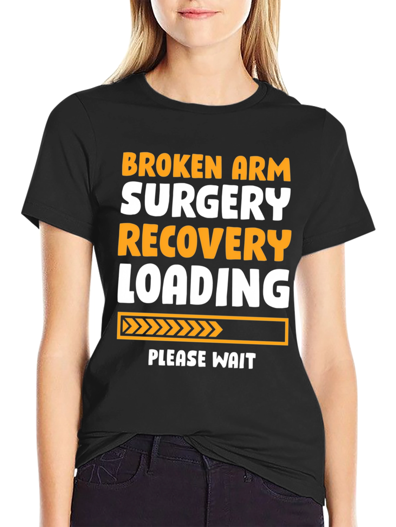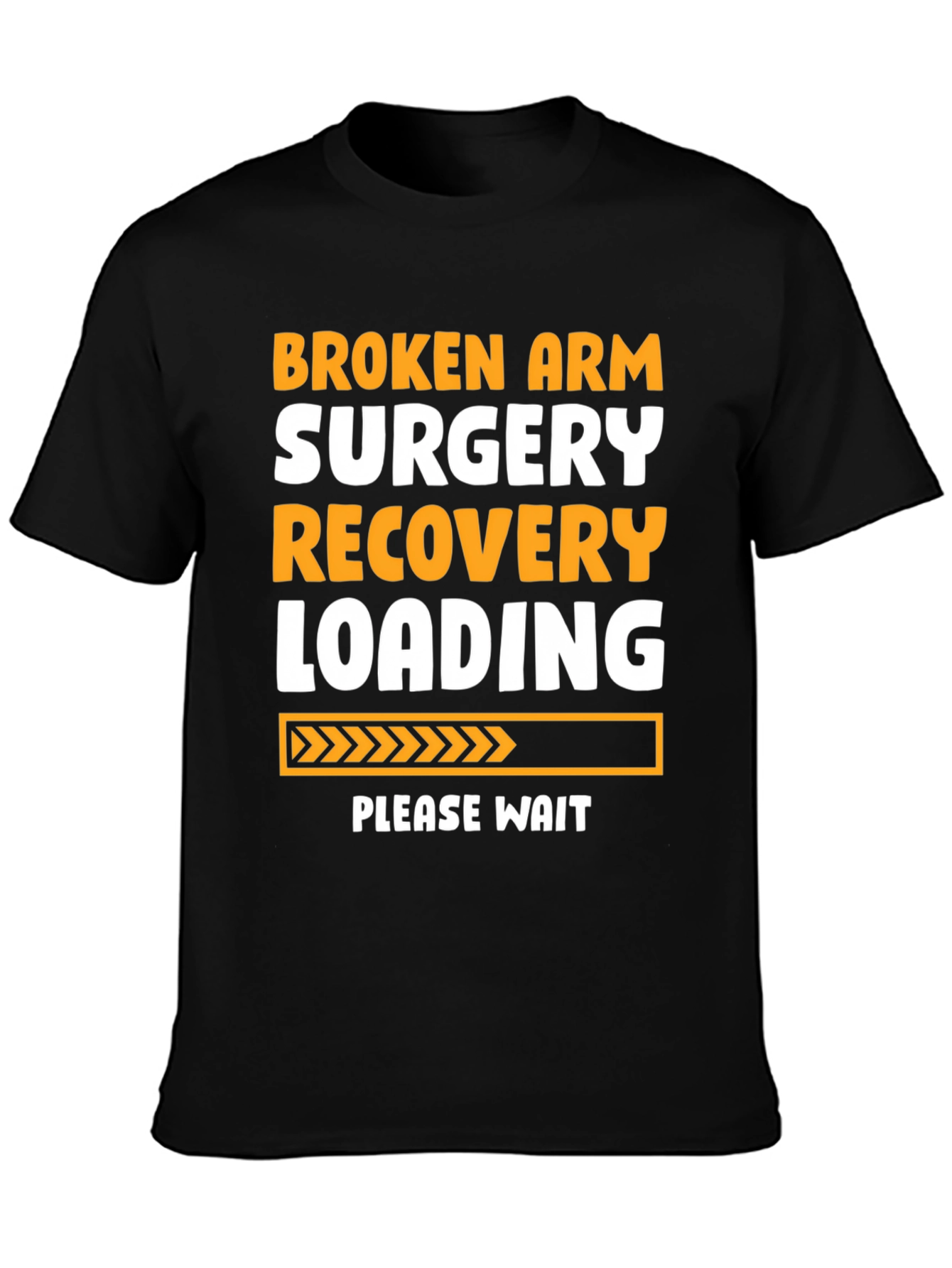 Get well soon with this recovery-themed t-shirt. Made from a comfortable, black fabric, this tee features a humorous design. The bold, white and orange text reads "Broken Arm Surgery Recovery LOADING... PLEASE WAIT," complete with a loading bar graphic. It's perfect for post-surgery comfort or a thoughtful get-well-soon gift. Wear it to appointments, at home, or while out and about to bring a smile to people's faces and show off your resilience during recovery. A funny and relatable way to express your experience!
