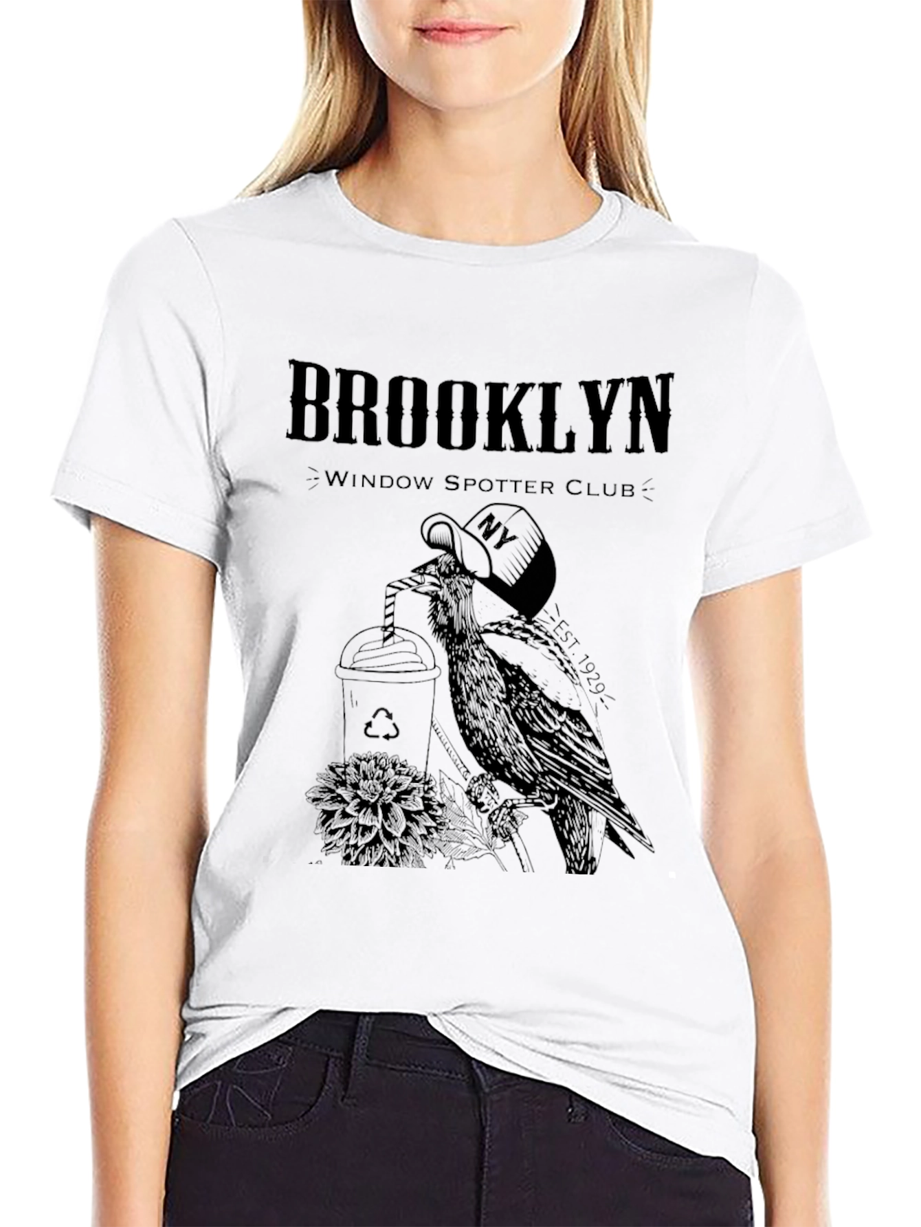 Show off your love for Brooklyn and quirky hobbies with this unique graphic t-shirt. The design features a stylish black and white graphic of a bird enjoying a drink, complete with a baseball cap and the words "Brooklyn Window Spotter Club." Made from comfortable, breathable cotton, this tee is perfect for everyday wear. Whether you're exploring the city, hanging out with friends, or simply relaxing at home, this t-shirt adds a touch of personality to any outfit. Its classic fit and soft fabric make it a versatile and stylish choice. Rock this tee to express your individuality and love for urban exploration.