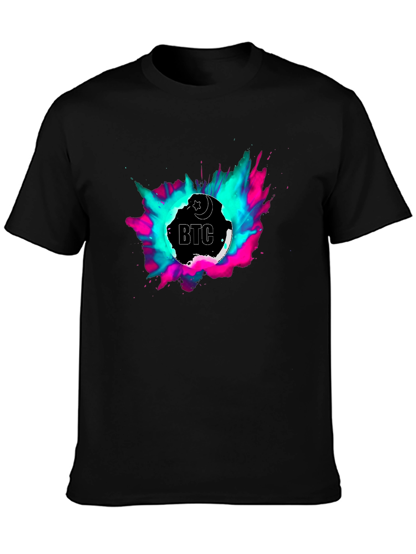 Show your love for crypto with this unique BTC t-shirt. Featuring a blacked out design with a crescent moon detail inside a stylized cloud of color, this tee is perfect for expressing your individuality. Made from a soft, comfortable fabric, it's ideal for everyday wear or special events. Whether you're a crypto enthusiast or just love unique fashion, this shirt is a must-have. Pair it with jeans or shorts for a casual, cool look. Get yours today and showcase your passion for blockchain!