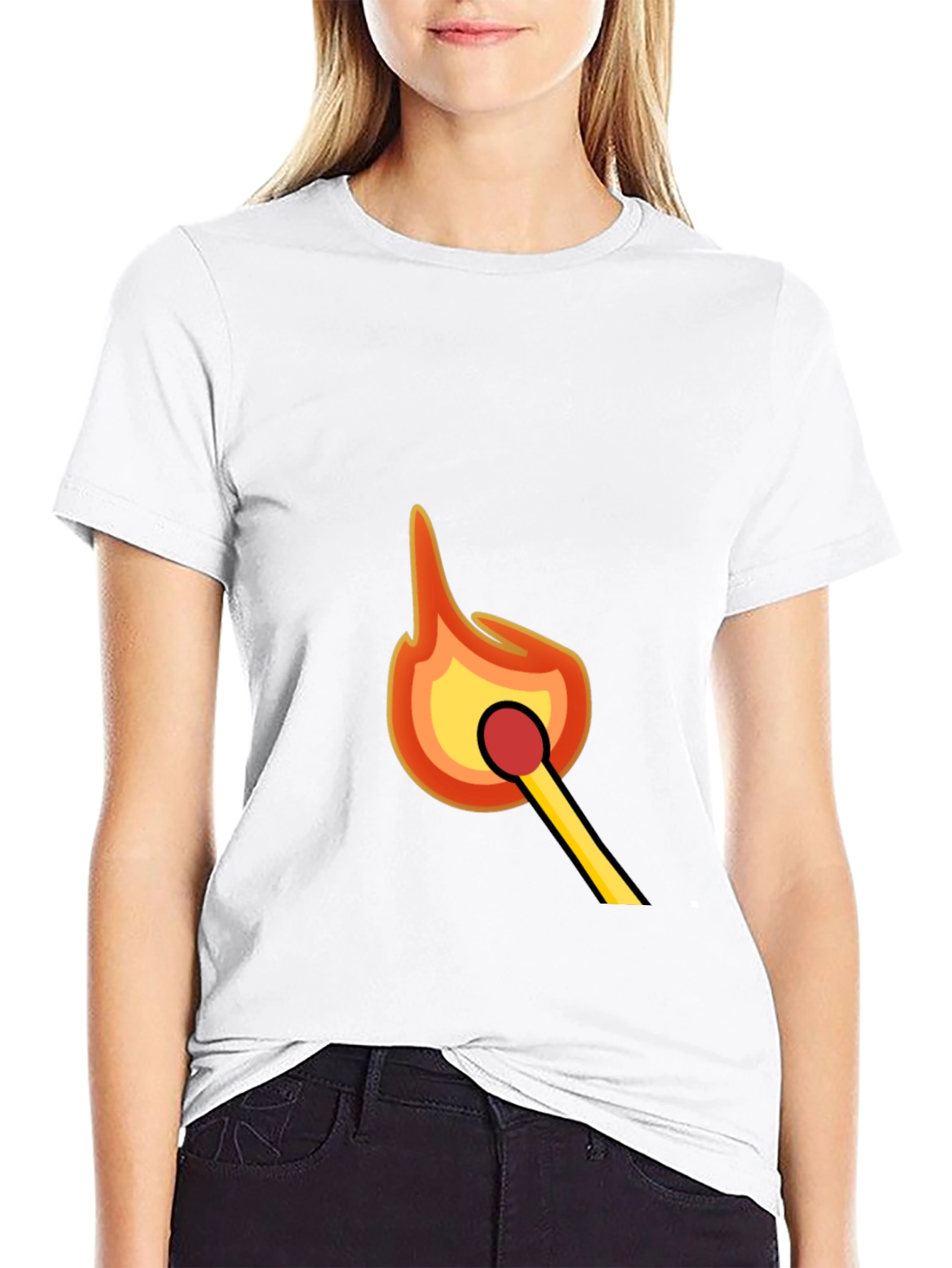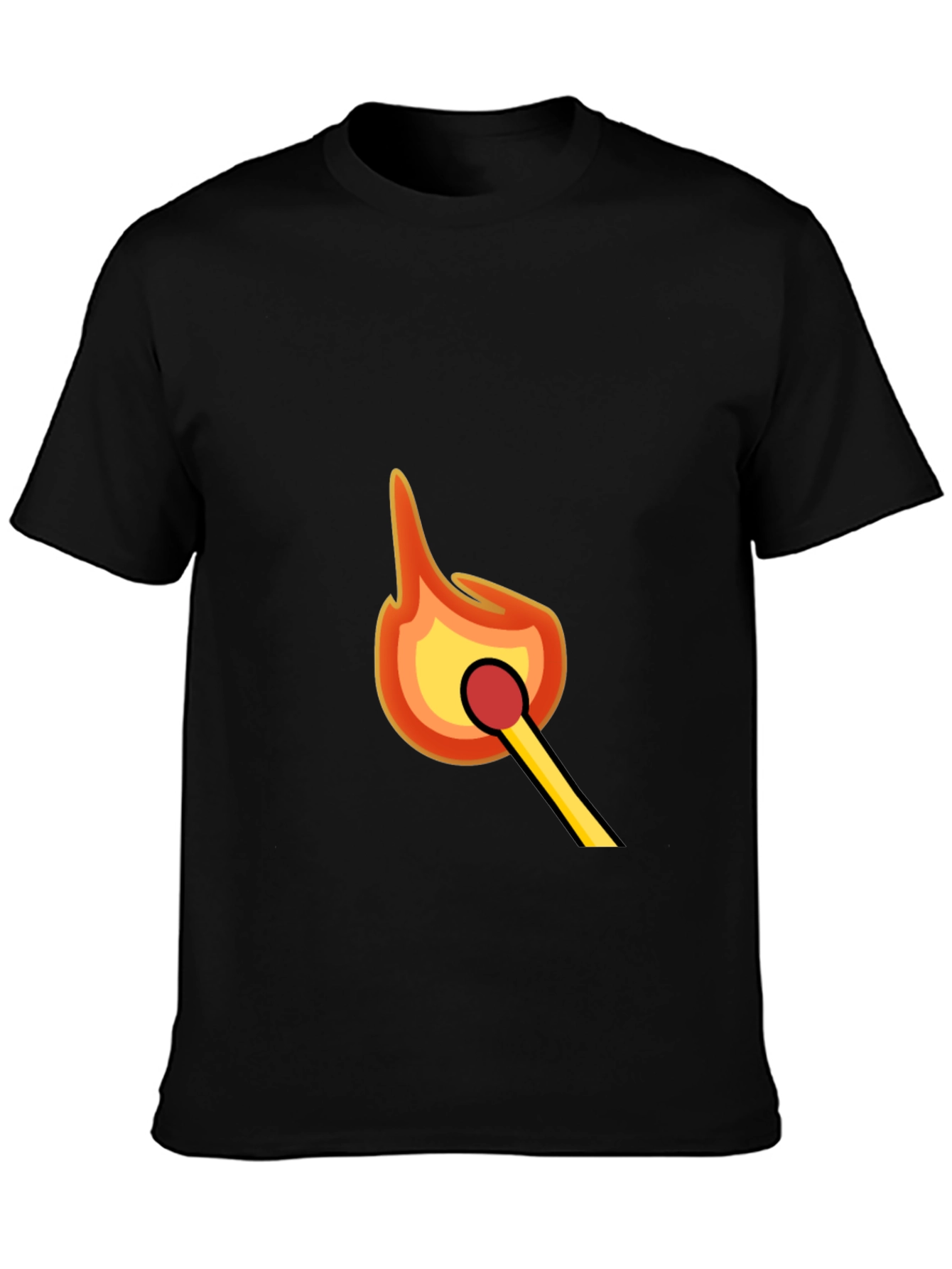 Ignite your style with this bold black t-shirt featuring a vibrant graphic of a match being lit. The vivid design showcases bright yellow and orange flames, creating a standout look. Crafted from a soft, comfortable cotton blend, this tee is perfect for everyday wear. Its classic fit ensures a relaxed and flattering silhouette. Show off your fiery personality at casual gatherings, concerts, or while simply relaxing. Upgrade your wardrobe with this eye-catching tee that's sure to spark conversation!