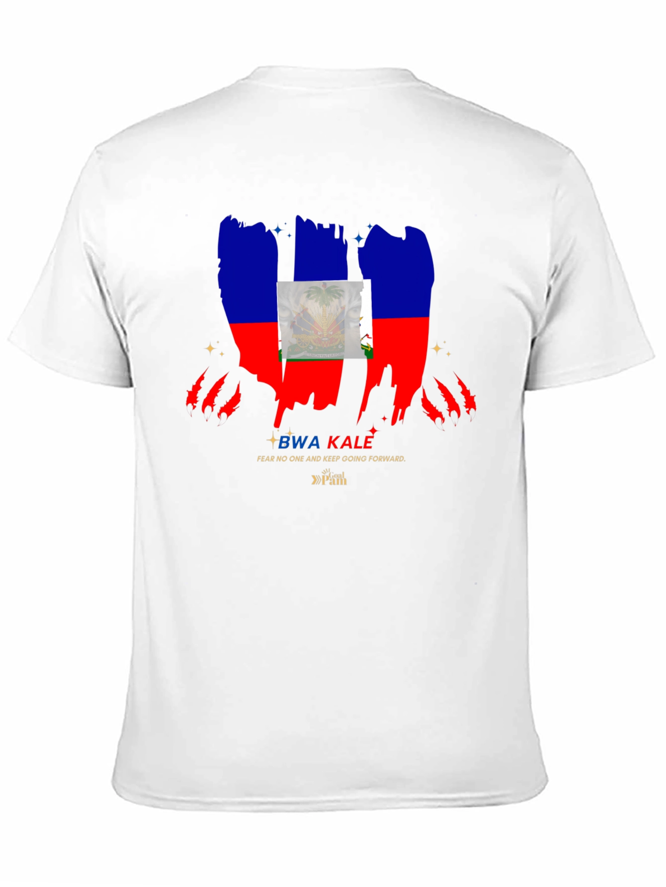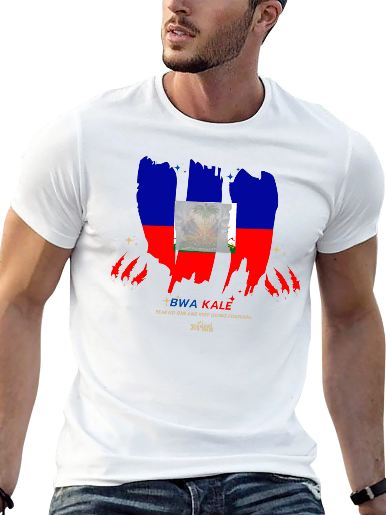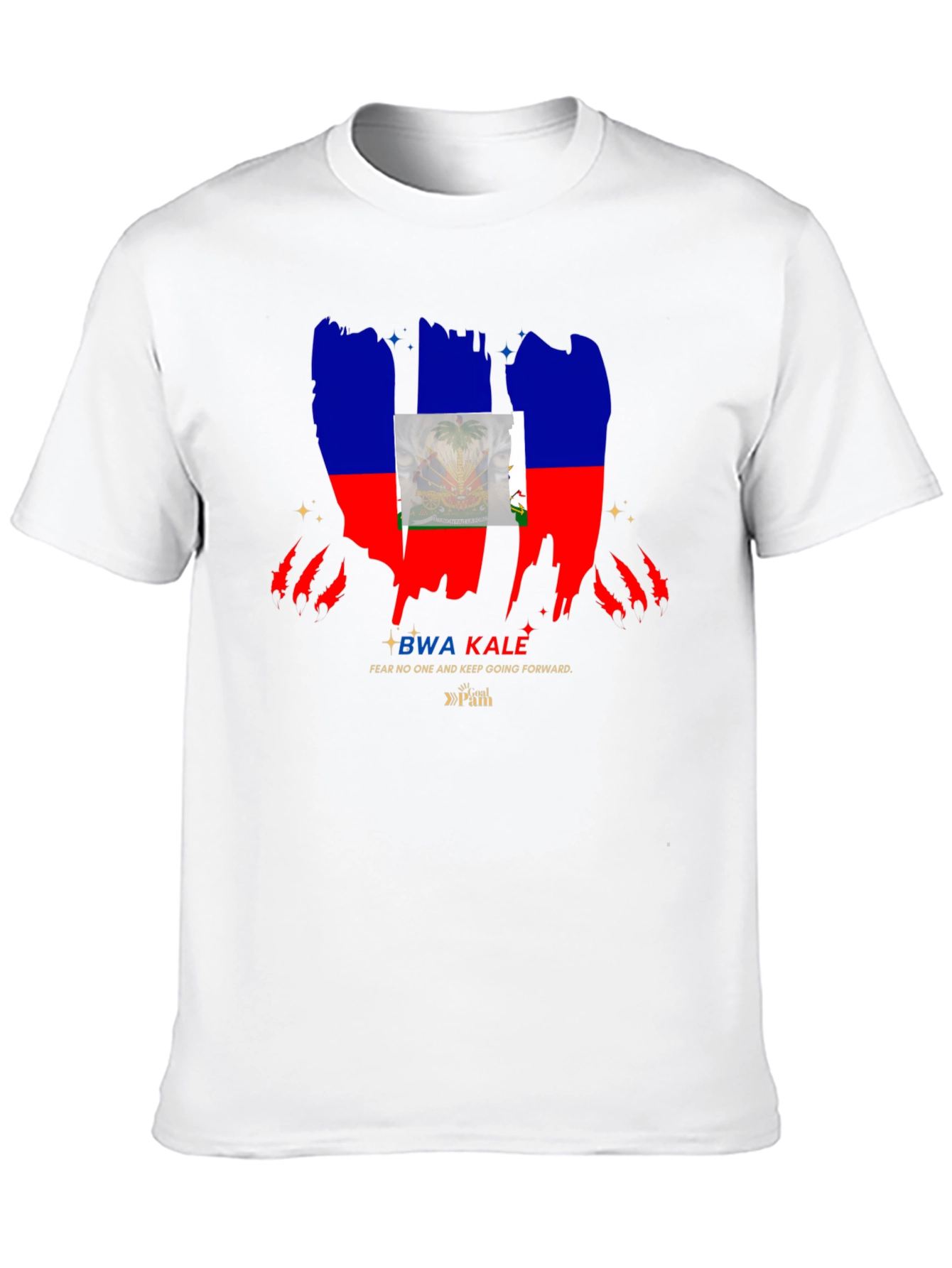 Show your Haitian pride with this striking black t-shirt. The design features a bold, distressed rendition of the Haitian flag, complete with the iconic coat of arms. Beneath the flag graphic, the text "BWA KALE" is printed, followed by "FEAR NO ONE AND KEEP GOING FORWARD", adding an empowering message to the design. The gold tone accentuates the logo. Ideal for casual wear, cultural events, or as a statement piece to express your heritage. This unique t-shirt is sure to catch the eye and spark conversations.