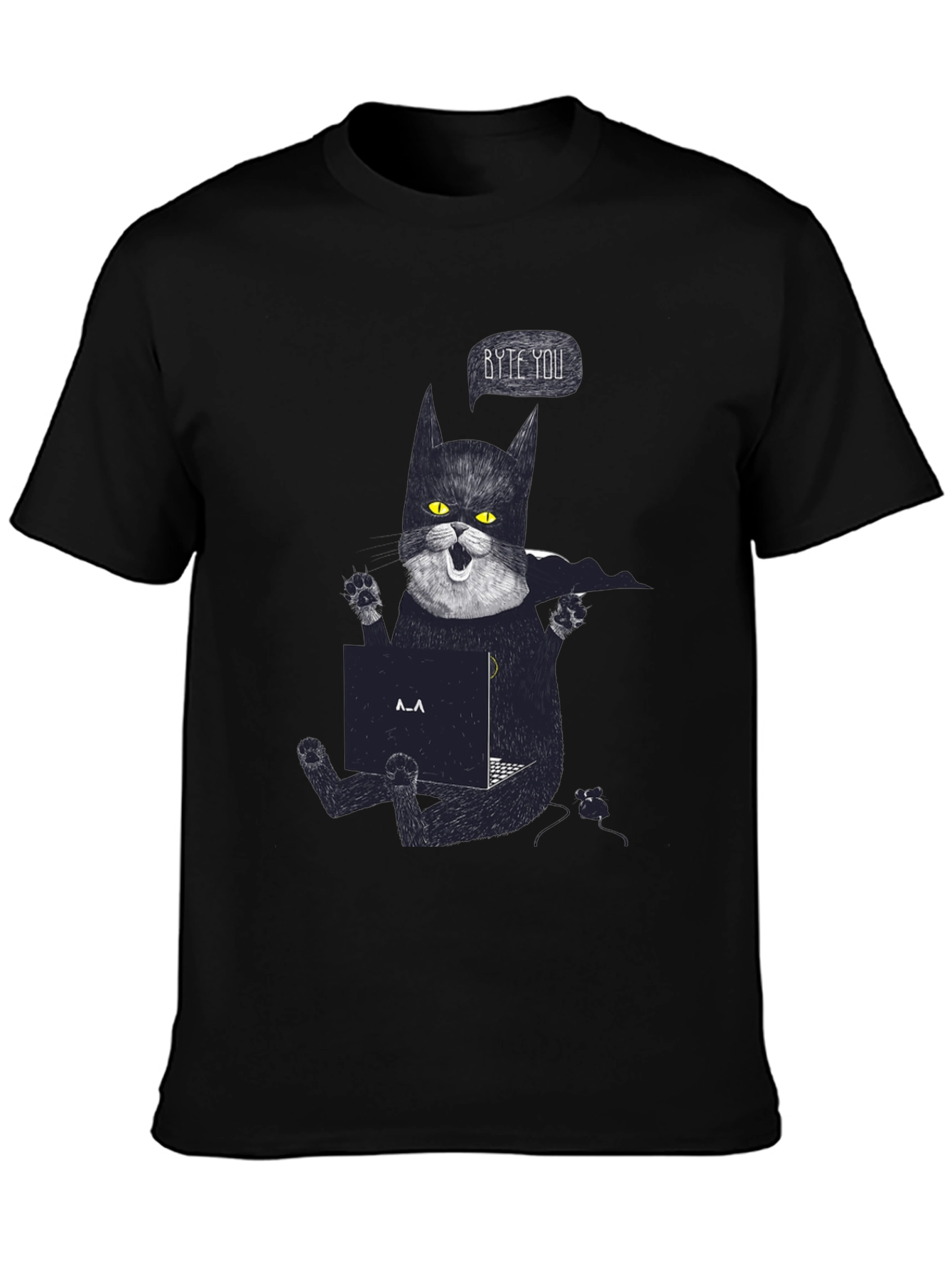 Unleash your inner geek with this Byte You T-Shirt! Featuring a unique illustration of a cat dressed as a vigilante typing on a laptop, this shirt is sure to turn heads. Made from soft, breathable fabric, this shirt offers all-day comfort and style. Perfect for programmers, cat lovers, and anyone who appreciates witty designs. Whether you're coding all night or just want to add some fun to your casual wear, this tee is an excellent choice. Get yours now!