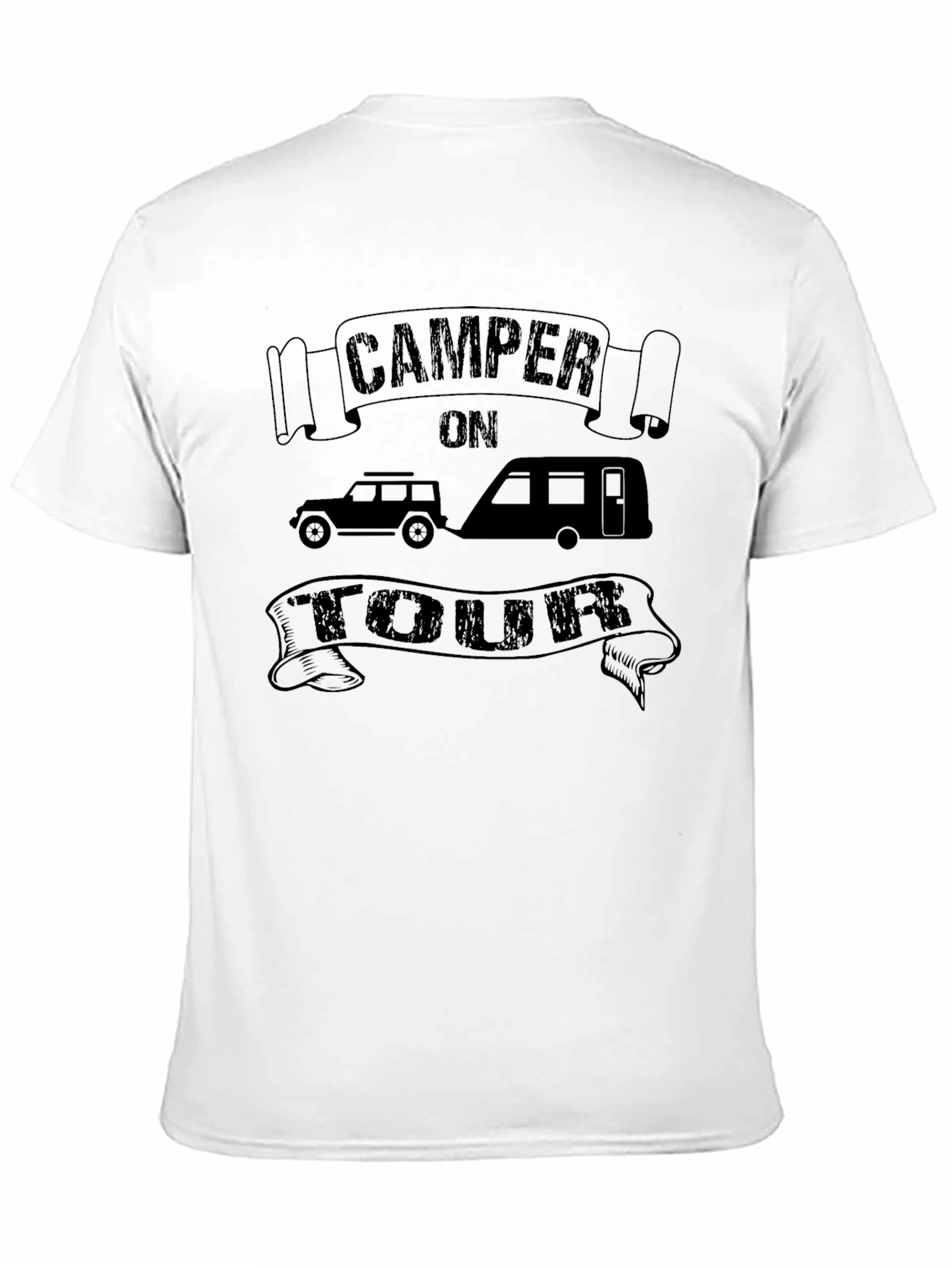 Get ready for your next adventure with this Camper on Tour T-Shirt! This black t-shirt features a unique design with “CAMPER ON TOUR” printed above and below an illustrated car and trailer. Made from soft, breathable cotton blend, this t-shirt provides all-day comfort. Perfect for camping trips, road trips, and outdoor adventures. This Tee is a perfect gift for the camping enthusiast in your life. Show off your love for the outdoors with this statement tee.