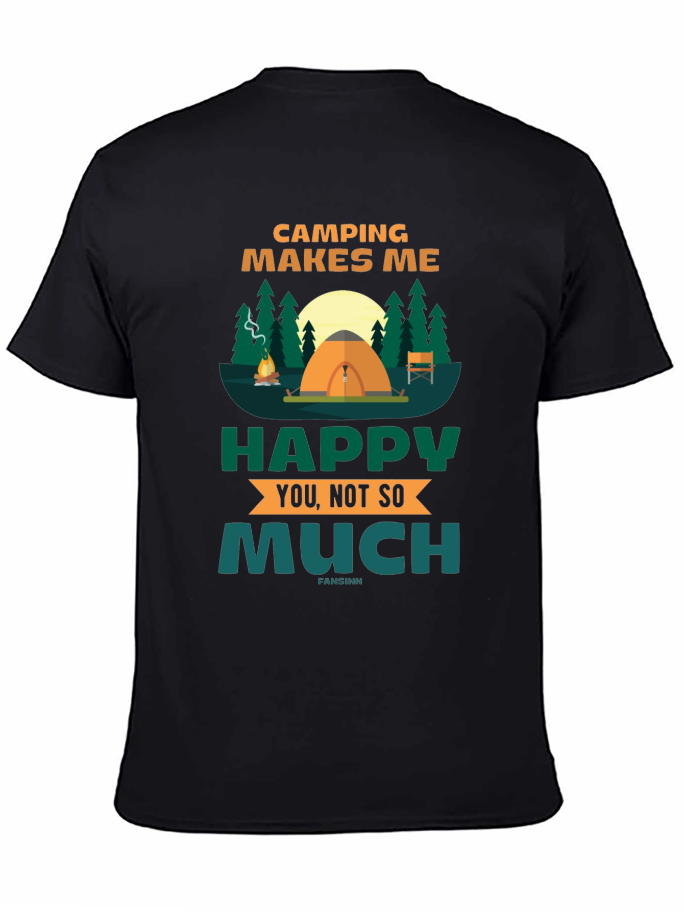 Embrace your love for the great outdoors with this eye-catching graphic tee. This black T-shirt features a vibrant and playful design showcasing a serene camping scene with a tent, campfire, and forest backdrop. The witty slogan, "Camping Makes Me Happy - You, Not So Much," adds a touch of humor, making it a perfect conversation starter. Made from a soft, comfortable fabric, this tee is ideal for casual wear, outdoor adventures, or simply lounging around. Show off your passion for camping with this unique and stylish shirt!
