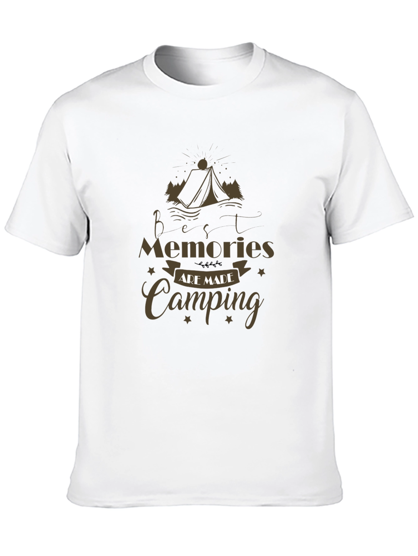 Embrace the spirit of the outdoors with this stylish black t-shirt. It features a unique graphic design that includes a tent, trees, and the phrase "Best Memories Are Made Camping." The design is in a muted brown tone, offering a subtle contrast against the shirt's dark backdrop. Made from what appears to be a soft, comfortable fabric, this tee is perfect for casual wear or your next camping adventure. Its classic fit makes it a versatile addition to any wardrobe. Show off your love for the great outdoors and inspire others to create lasting memories around the campfire with this eye-catching t-shirt.