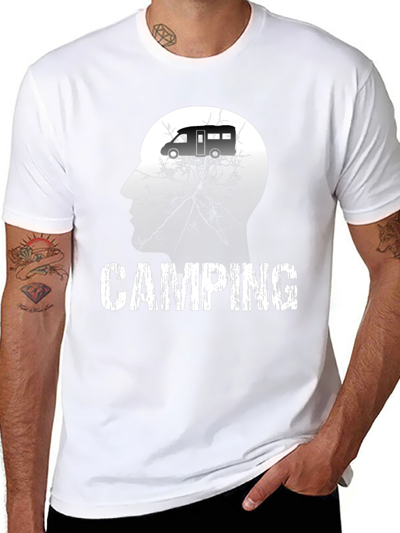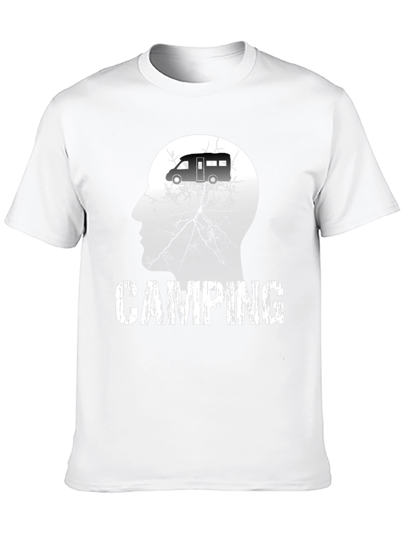 Show off your love for the outdoors with this unique black t-shirt! The tee features a creative graphic design showcasing a silhouette of a head filled with a camper van and tree roots, symbolizing the spirit of adventure and a love for camping. Boldly printed across the chest is the word 'CAMPING'. Made from comfortable materials, this tee is perfect for casual wear or your next outdoor adventure. Grab this shirt and wear your passion for camping on your sleeve!
