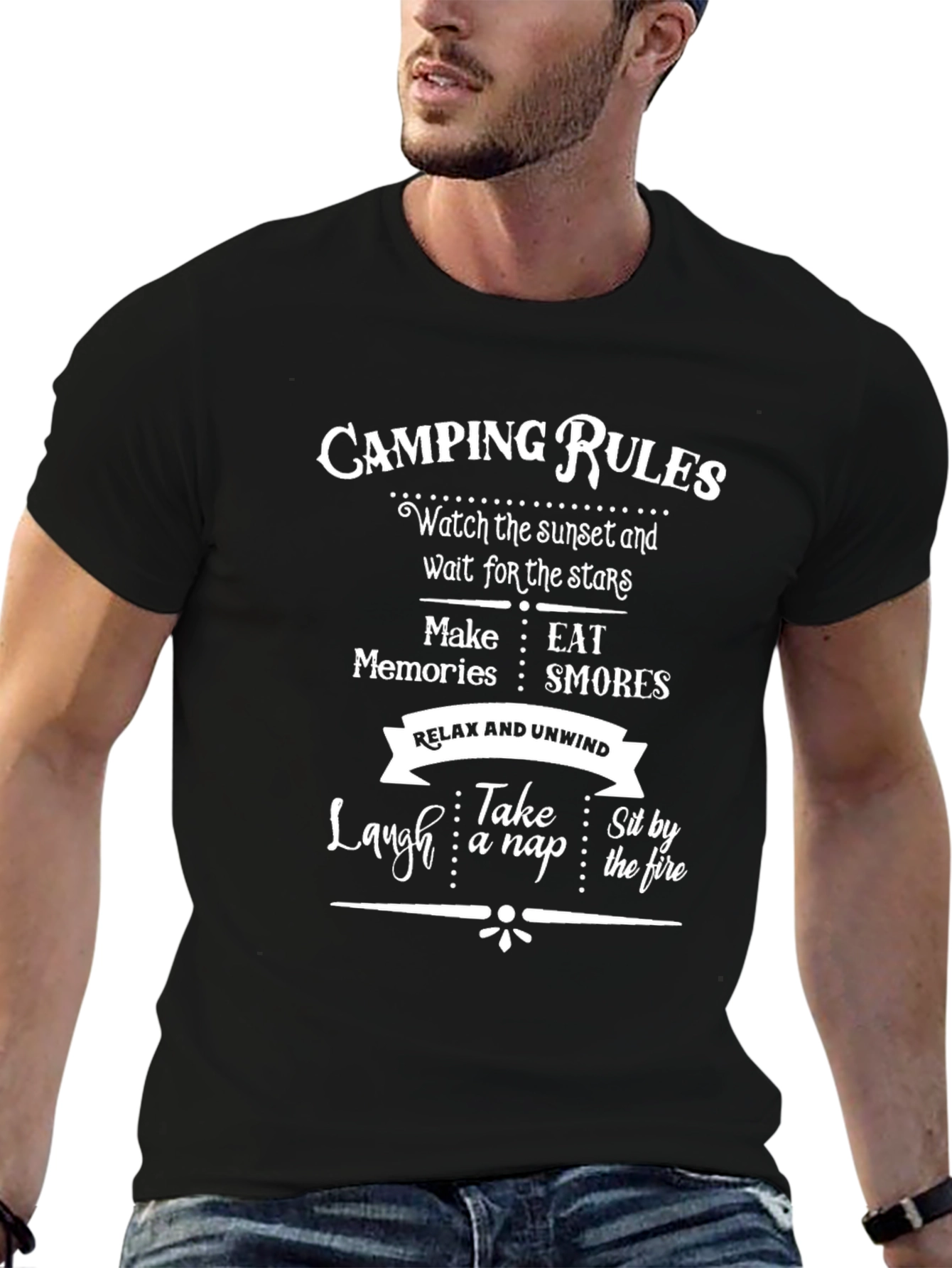 Embrace the camping spirit with this comfortable and stylish graphic t-shirt. The black tee features a creative white design listing "Camping Rules," including "Watch the sunset and Wait for the stars," "Make Memories," "Eat S'mores," "Relax and Unwind," "Laugh," "Take a nap," and "Sit by the fire." Made from a soft, breathable fabric, this tee ensures comfort whether you're lounging at the campsite or exploring the great outdoors. Perfect for camping trips, outdoor adventures, or casual everyday wear, this shirt is a must-have for any nature lover. Show off your passion for camping with this unique and eye-catching tee!