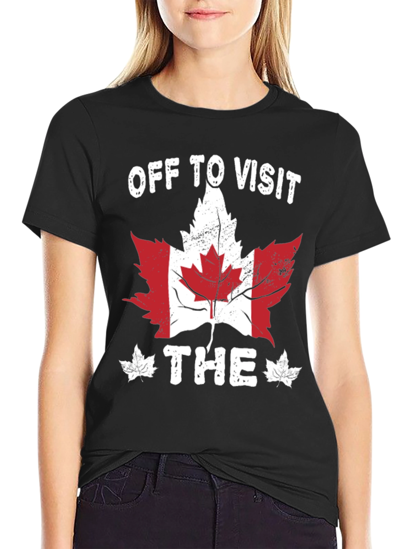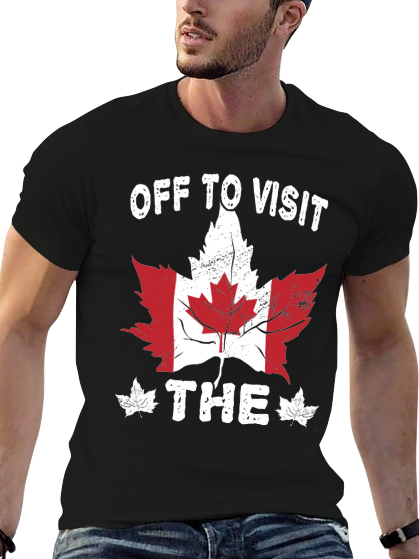 Show your love for Canada with this stylish black t-shirt. Featuring a distressed graphic of the Canadian maple leaf filled with the colors of the Canadian flag. The words "OFF TO VISIT THE" complete the look. This tee is perfect for tourists visiting Canada, Canadian expats, or anyone with a love for the Great White North! Soft and comfortable, this shirt is ideal for everyday wear. Pair it with jeans or shorts for a casual, patriotic style. Perfect for Canada Day or any day you want to show your Canadian pride.