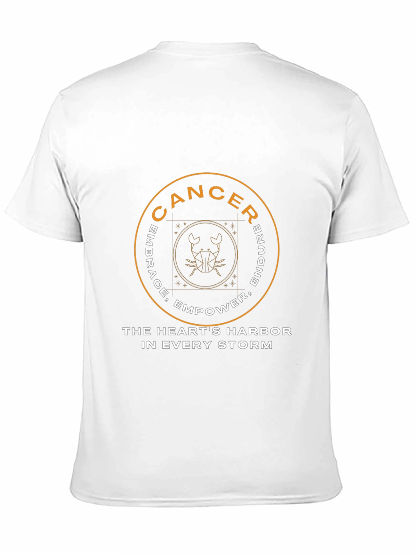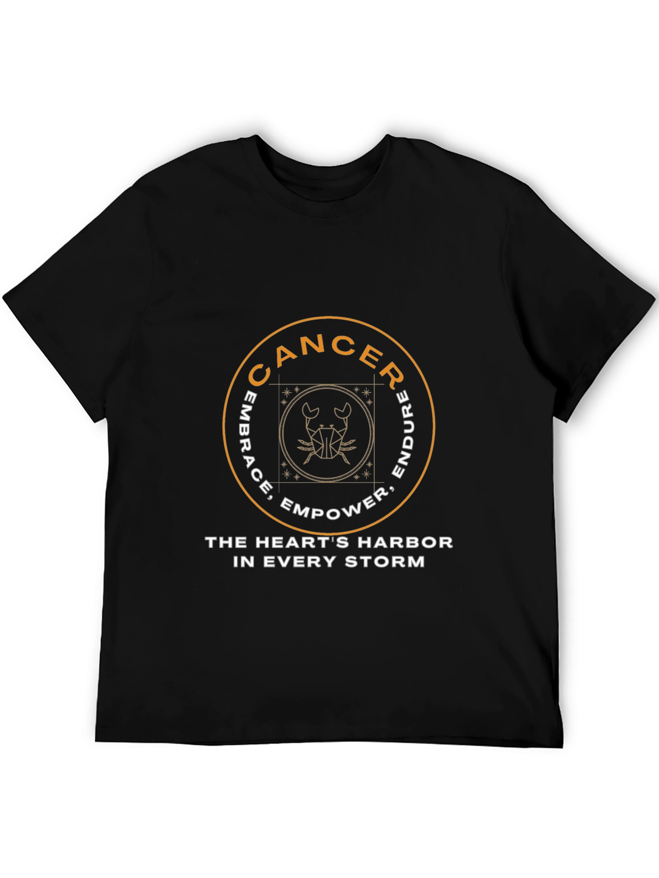Show your zodiac pride with this stylish black T-shirt featuring a unique Cancer design. The circular graphic showcases the word 'CANCER' alongside motivational words: Embrace, Empower, Endure. A modern crab symbol sits inside a geometric square. The inspirational phrase "THE HEART'S HARBOR IN EVERY STORM" adds depth. Made from comfortable, breathable fabric, this shirt is perfect for everyday wear. Whether you're a Cancer or love someone who is, this tee makes a thoughtful and meaningful gift. Express your astrological identity with this eye-catching and comfortable T-shirt.