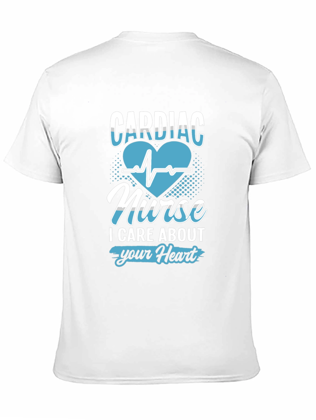 Show your appreciation for cardiac nurses with this eye-catching graphic t-shirt. Featuring a bold design with the words "Cardiac Nurse" and "I Care About Your Heart" in a stylish, gradient font, this shirt is perfect for everyday wear. The design also incorporates a heart and heartbeat graphic with a unique dotted background. This tee is a comfortable black and appears to be made of soft, breathable fabric. It's an ideal gift for nurses or anyone in the medical field who wants to display their passion with pride and style. Get yours today!