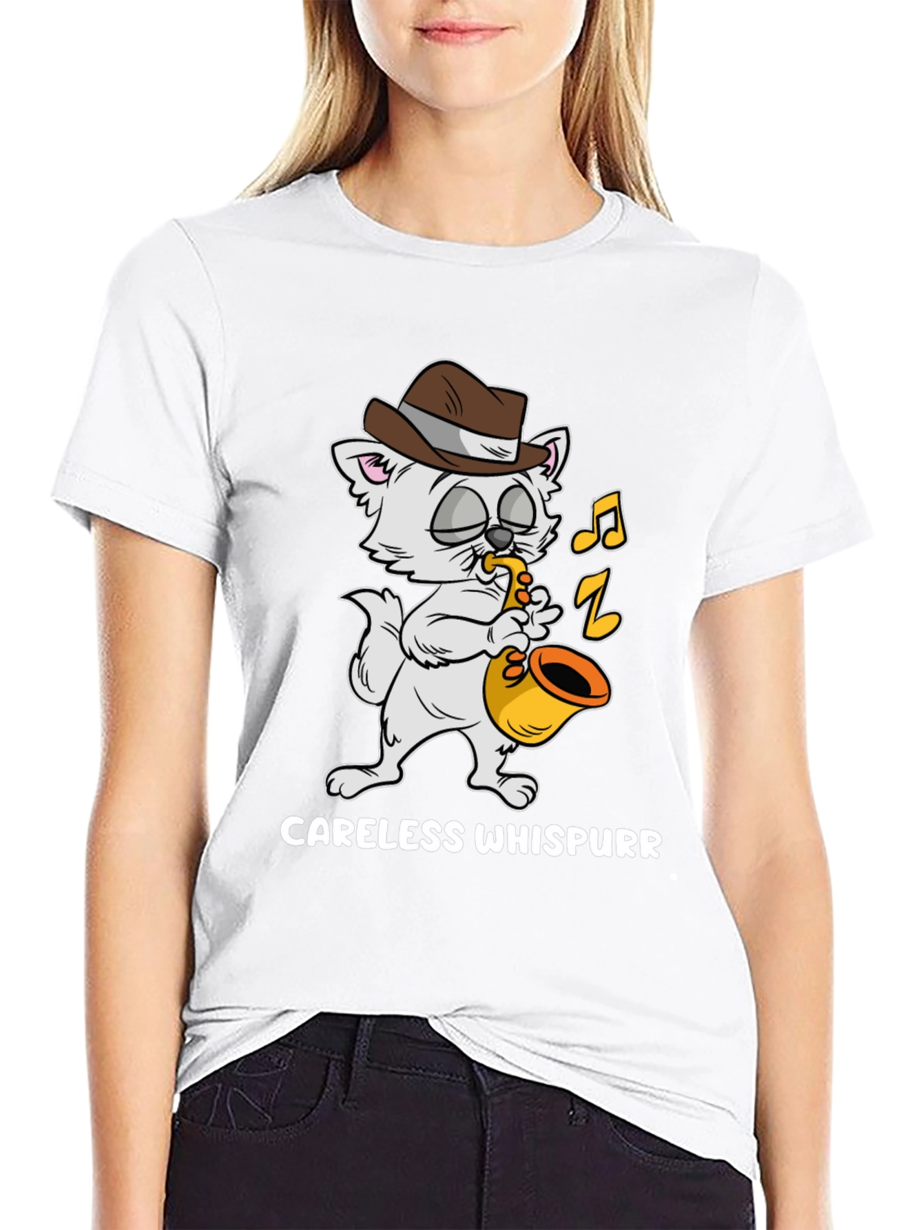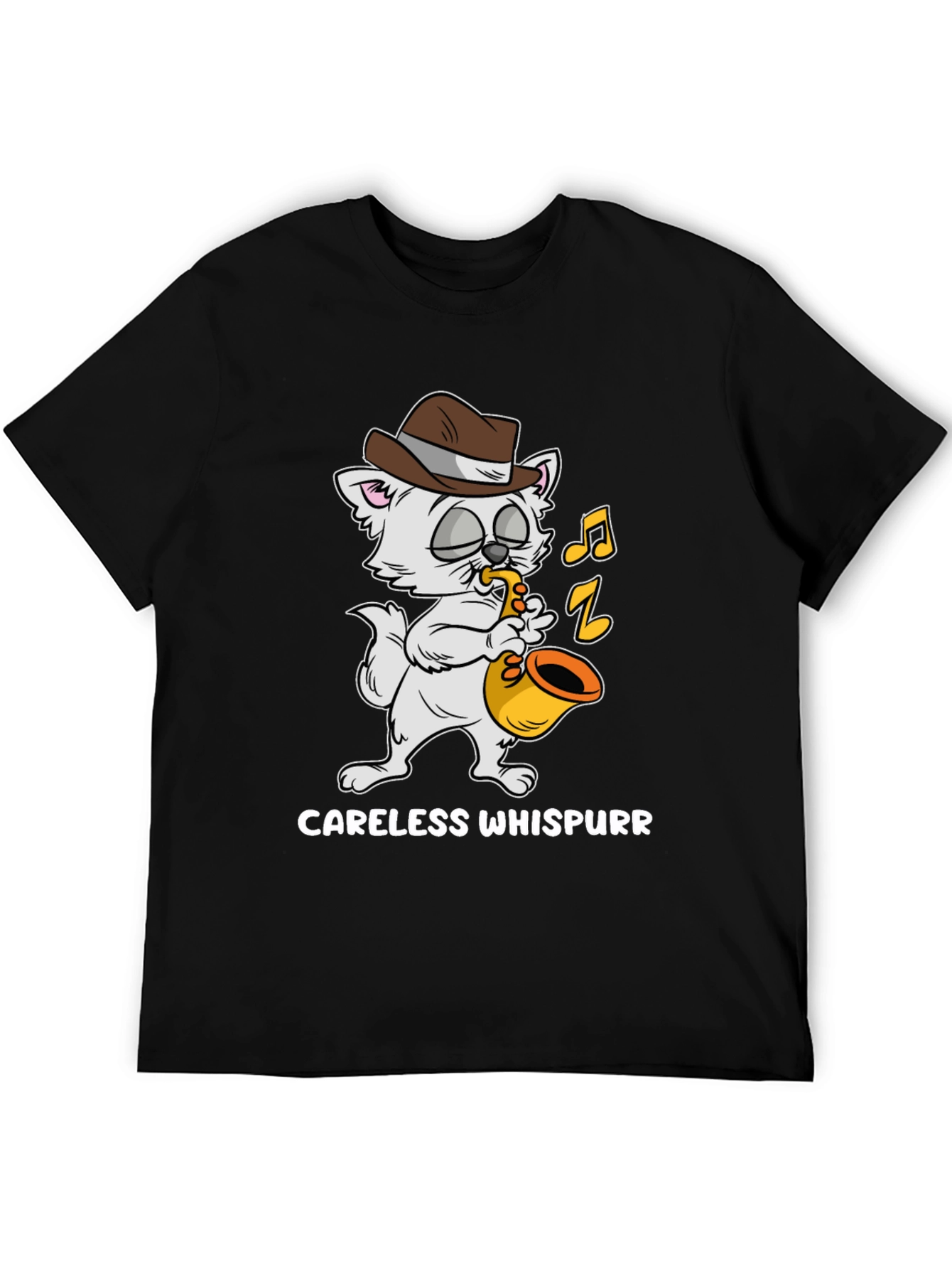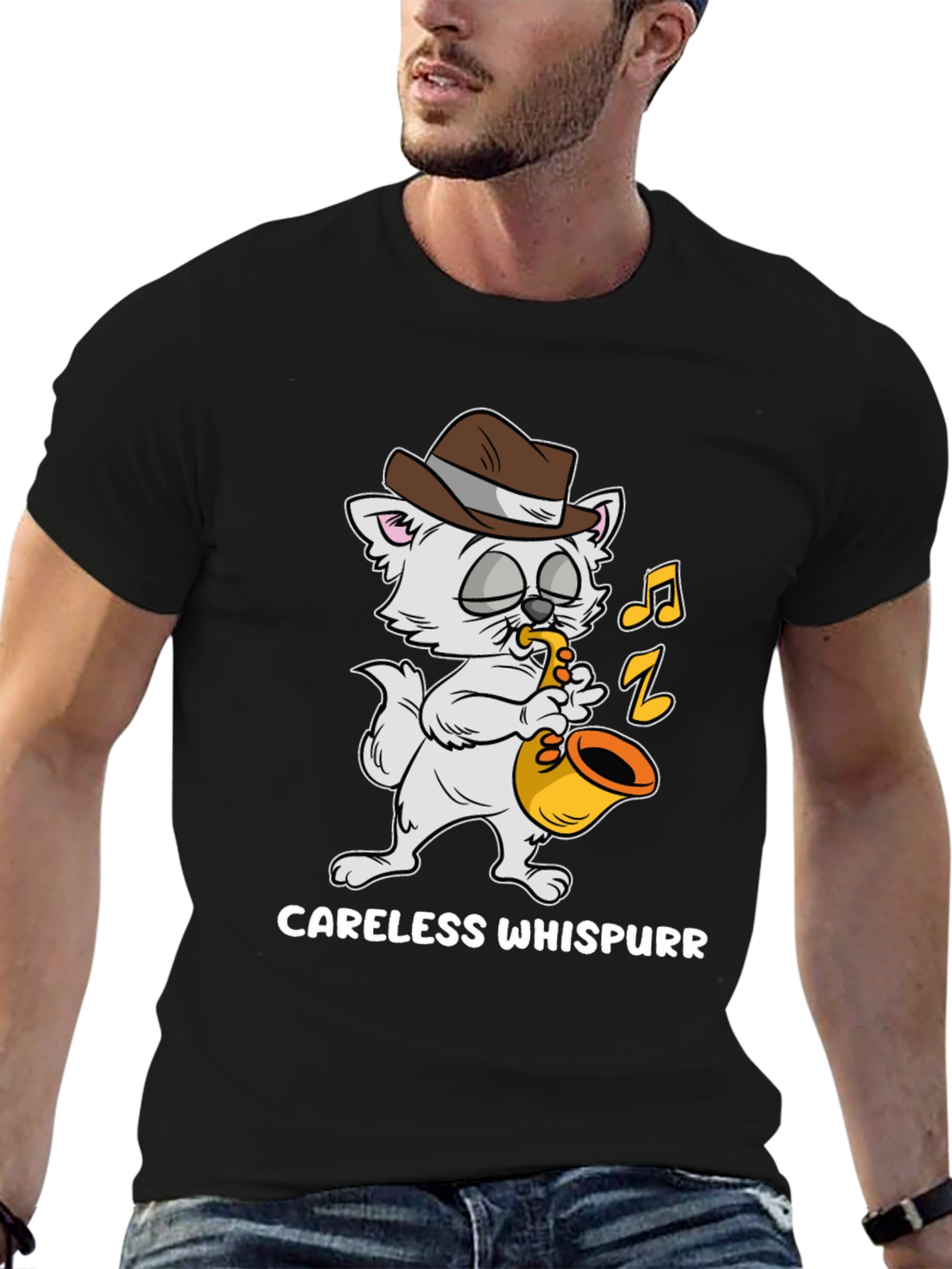 Get your paws on this hilarious Careless Whispurr t-shirt! Featuring a cool cartoon cat rocking a brown fedora and playing a saxophone, complete with musical notes. The funny pun makes it a purr-fect conversation starter. This black tee is made from comfortable fabric, ideal for casual wear. Great for cat lovers, music enthusiasts, or anyone with a sense of humor. Show off your quirky style and let the world know you're ready to jam with this unique shirt!