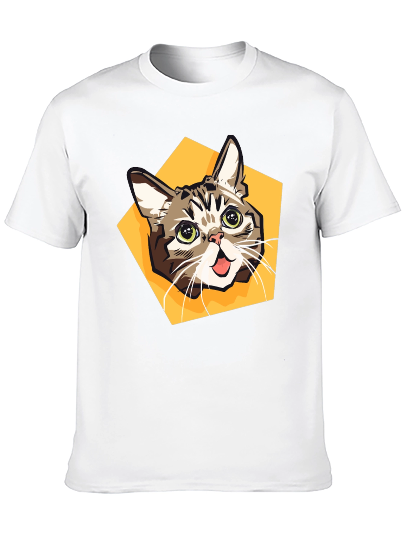 Show off your love for cats with this fun and stylish black graphic tee. The shirt features a cartoon-style illustration of a cat's head set against a yellow diamond background. Made from soft, breathable fabric, this t-shirt offers all-day comfort and is perfect for casual wear. The design is eye-catching and unique, making it a great conversation starter. Ideal for everyday wear, cat lovers, or as a fun gift. This tee combines comfort, style, and feline enthusiasm!