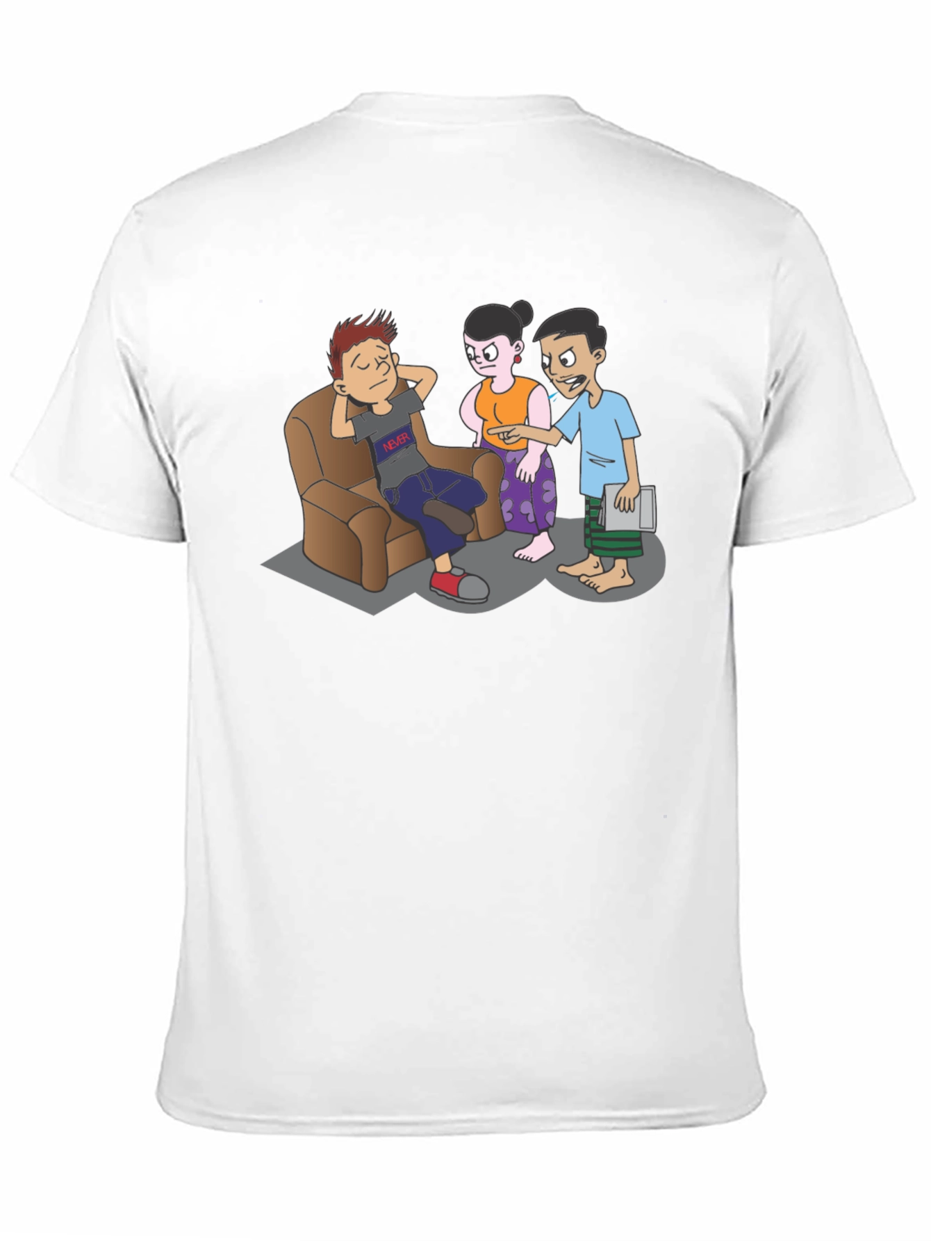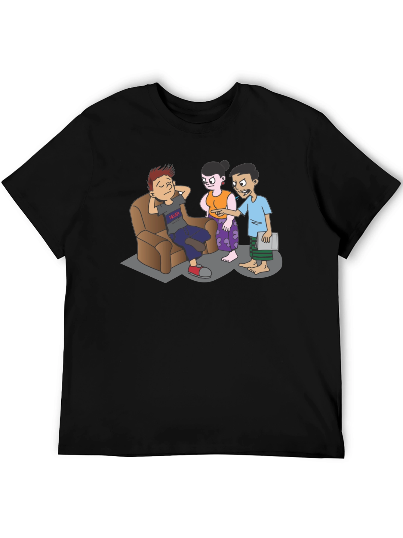 Showcase your quirky side with this eye-catching black t-shirt. The tee features a colorful cartoon graphic of a family dispute, where a young man on a couch is being lectured by his parents. The design is fun and unique, adding a playful touch to your everyday wear. Made from comfortable, breathable fabric, this t-shirt is perfect for casual outings, lounging at home, or expressing your individuality. Pair it with jeans, shorts, or your favorite bottoms for a relaxed yet stylish look. A great conversation starter!