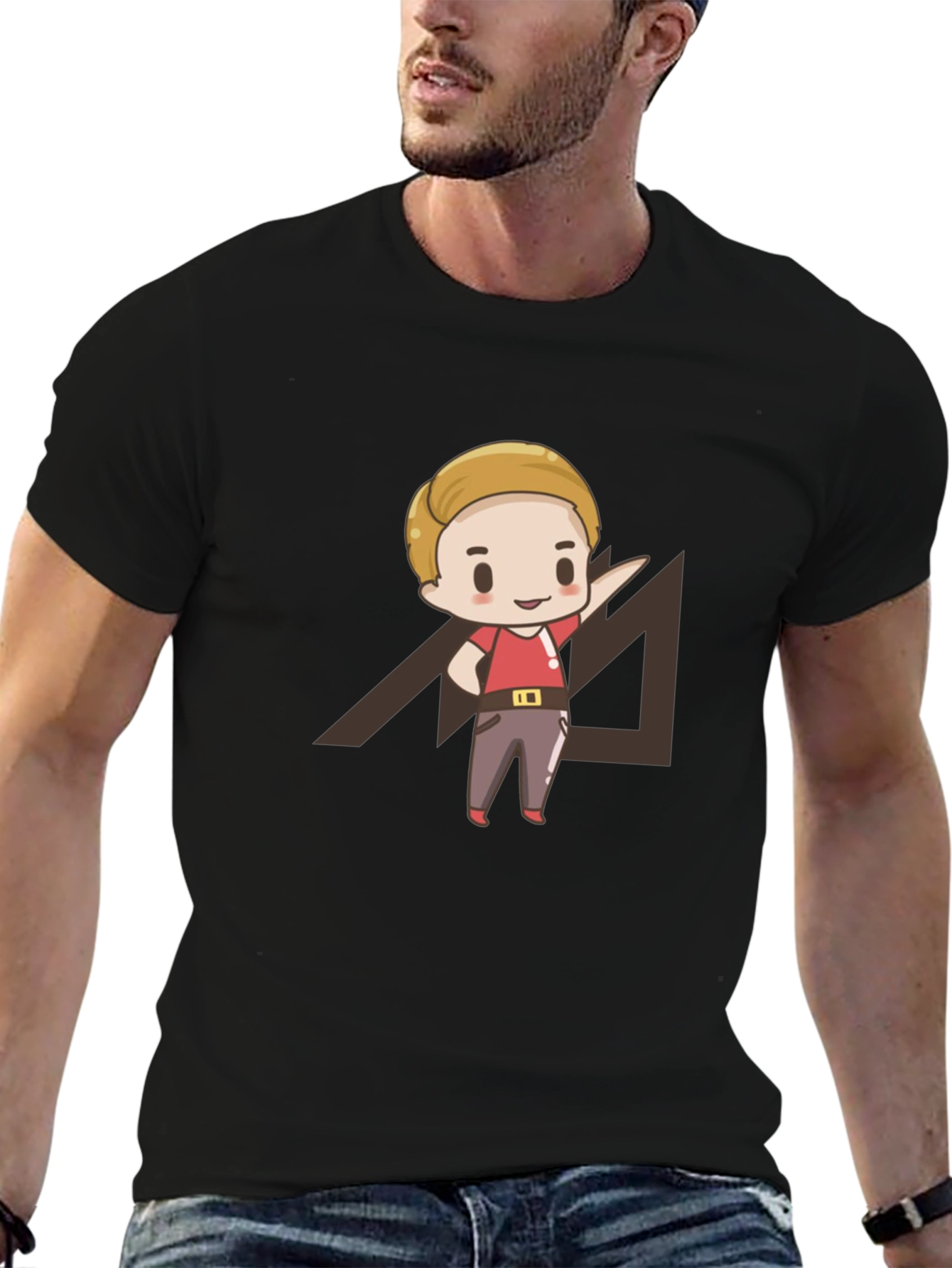 Show off your fun side with this black graphic tee. Featuring a cartoon-style character print over a geometric design, this shirt is sure to turn heads. Crafted from a comfortable fabric, it's perfect for casual wear or a relaxed weekend outing. Pair it with jeans or shorts for an effortlessly cool style. This tee is a must-have for cartoon and design lovers. Get yours today and add a playful touch to your wardrobe!