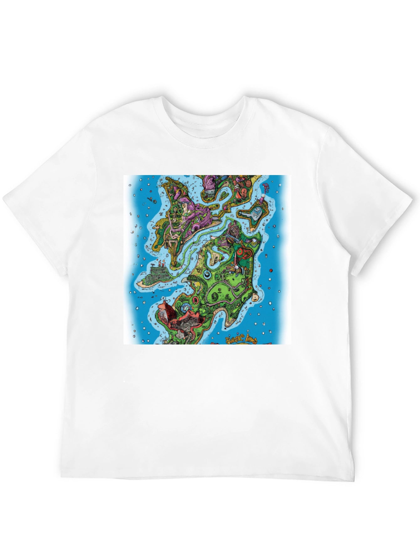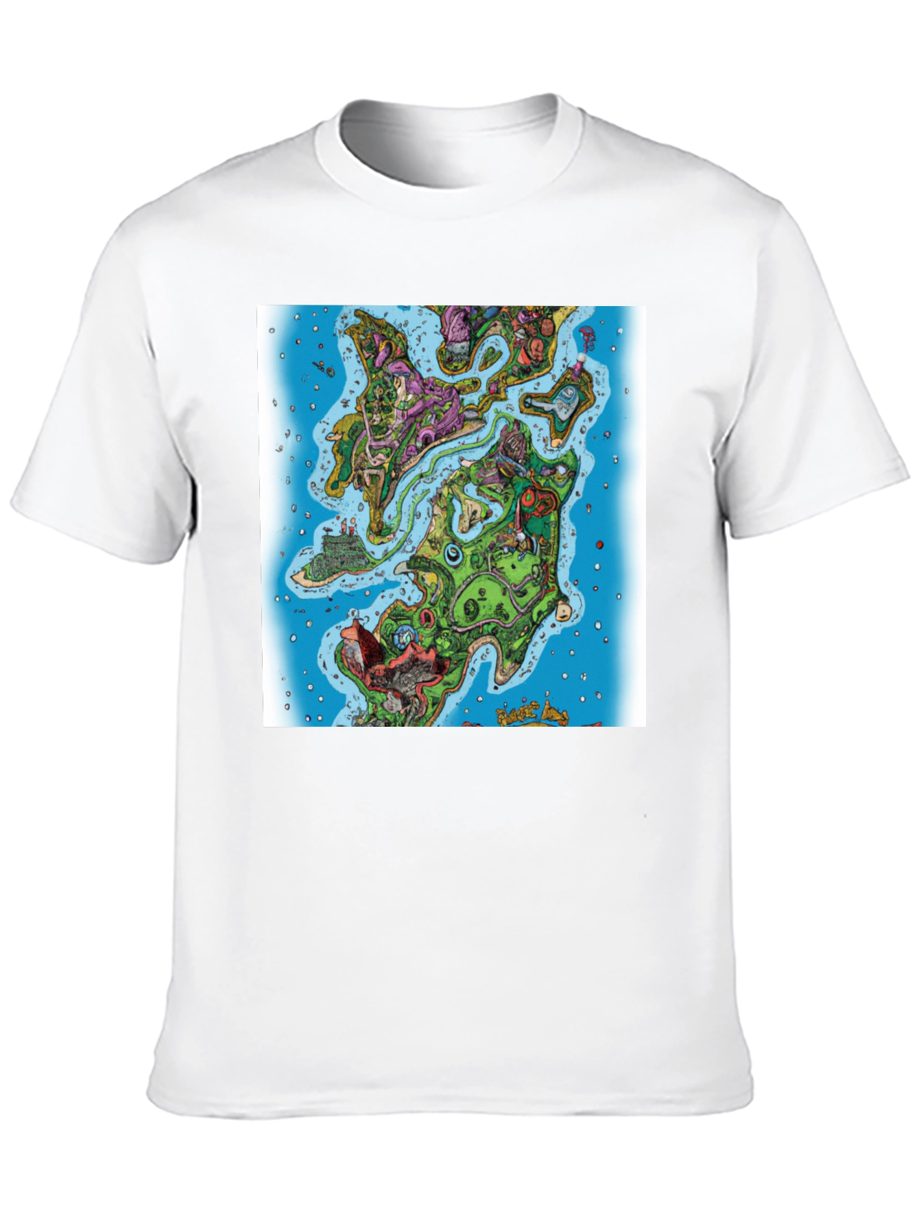 Show off your unique style with this eye-catching black t-shirt. The shirt features a vibrant, detailed cartoon map graphic. The colorful design is set against a light blue background, creating a fun and playful aesthetic. The shirt appears to be made from a soft, comfortable material, perfect for everyday wear. The image displays the shirt on a model, suggesting a casual and relaxed fit. Pair this t-shirt with your favorite jeans or shorts for a standout look that is sure to turn heads. It's a great piece for anyone who loves unique graphic tees and wants to express their individuality.