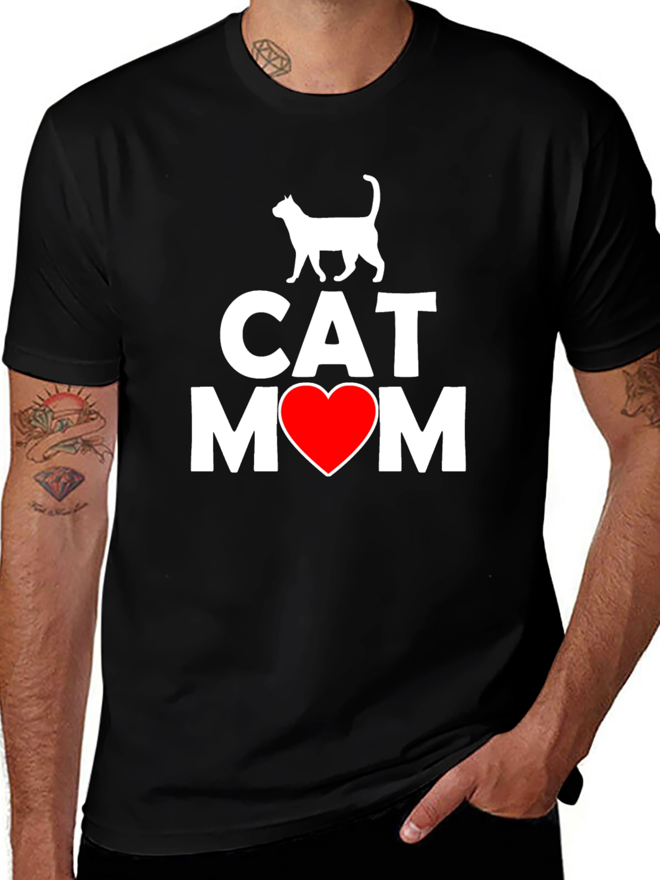 Show your love for your feline friend with this stylish black t-shirt. Featuring a clean and modern design, this tee showcases a white cat silhouette above the words 'CAT MOM' in bold, white lettering. A vibrant red heart replaces the 'O' in MOM, adding a pop of color and warmth to the design. Perfect for casual wear, this comfortable t-shirt is ideal for cat lovers everywhere. The classic fit and soft fabric make it a great addition to any wardrobe. Makes a thoughtful gift for any cat-obsessed mom!