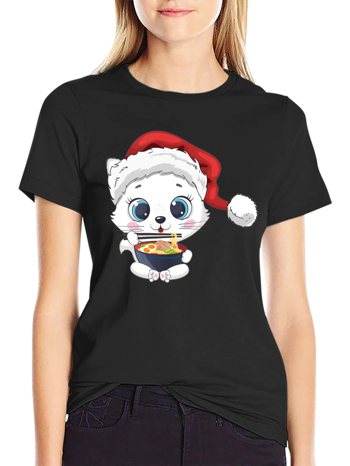 This black t-shirt features a cute cartoon cat wearing a Santa hat. The cat is holding a bowl of ramen and chopsticks. The design is bright and colorful, making it a fun and festive choice for the holiday season. The shirt appears to be made of a soft, comfortable material, ideal for everyday wear. It's a great way to show off your love for cats and ramen while spreading some Christmas cheer. Perfect for casual outings or holiday gatherings.