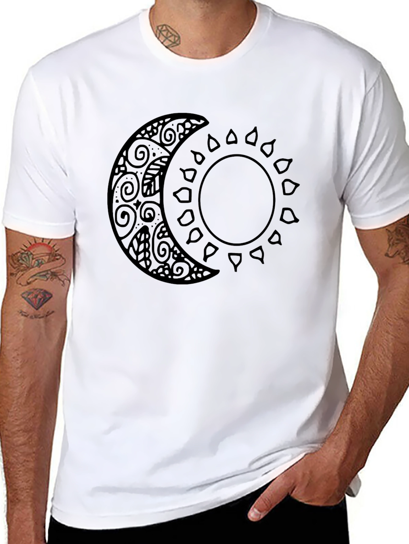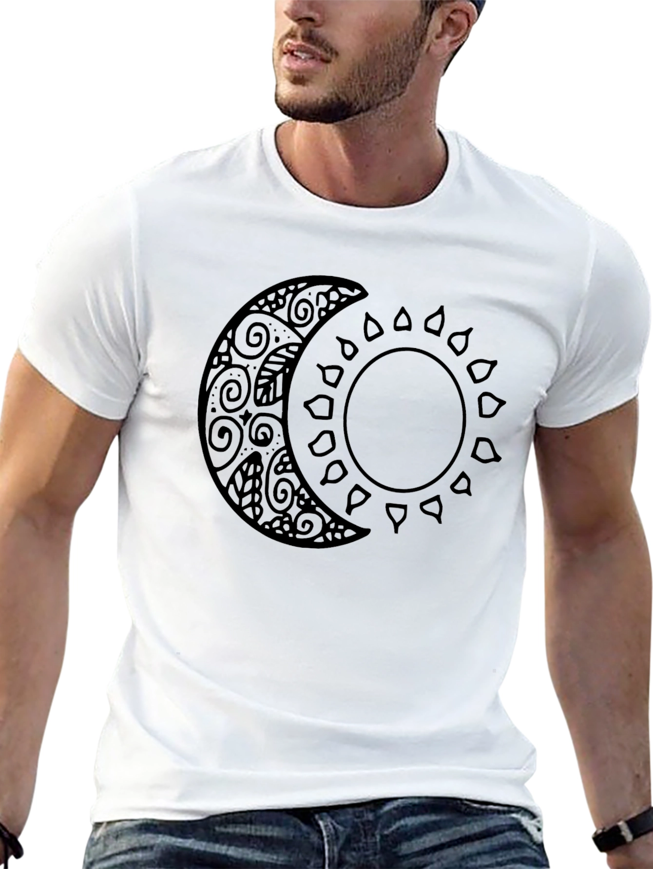 Embrace cosmic style with this striking black t-shirt. Featuring a bold graphic print of a half sun and half intricately designed moon, this tee is a unique statement piece. The soft fabric and classic cut offer a comfortable fit for everyday wear. Perfect for casual outings, concerts, or expressing your individual style. This shirt is a versatile addition to any wardrobe. Make a statement with celestial-inspired fashion!