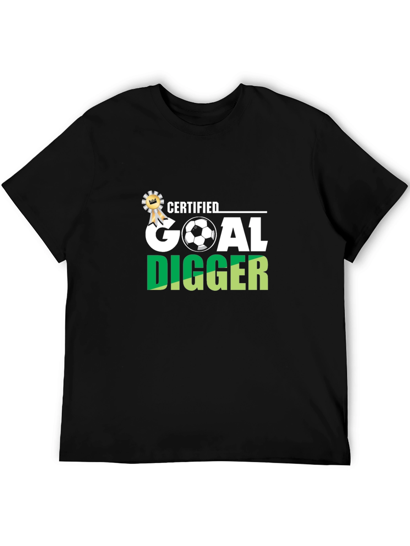 Show off your love for soccer with this eye-catching black t-shirt! The bold design features the words "CERTIFIED GOAL DIGGER" in a stylish font, complete with a soccer ball graphic. The word "DIGGER" is in green gradient giving the shirt a unique and sporty look. Made from a comfortable fabric, this t-shirt is perfect for everyday wear, whether you're hitting the field or hanging out with friends. It's a great way to express your passion for the game and stand out from the crowd. Get yours today and show the world you're a true "Goal Digger"!