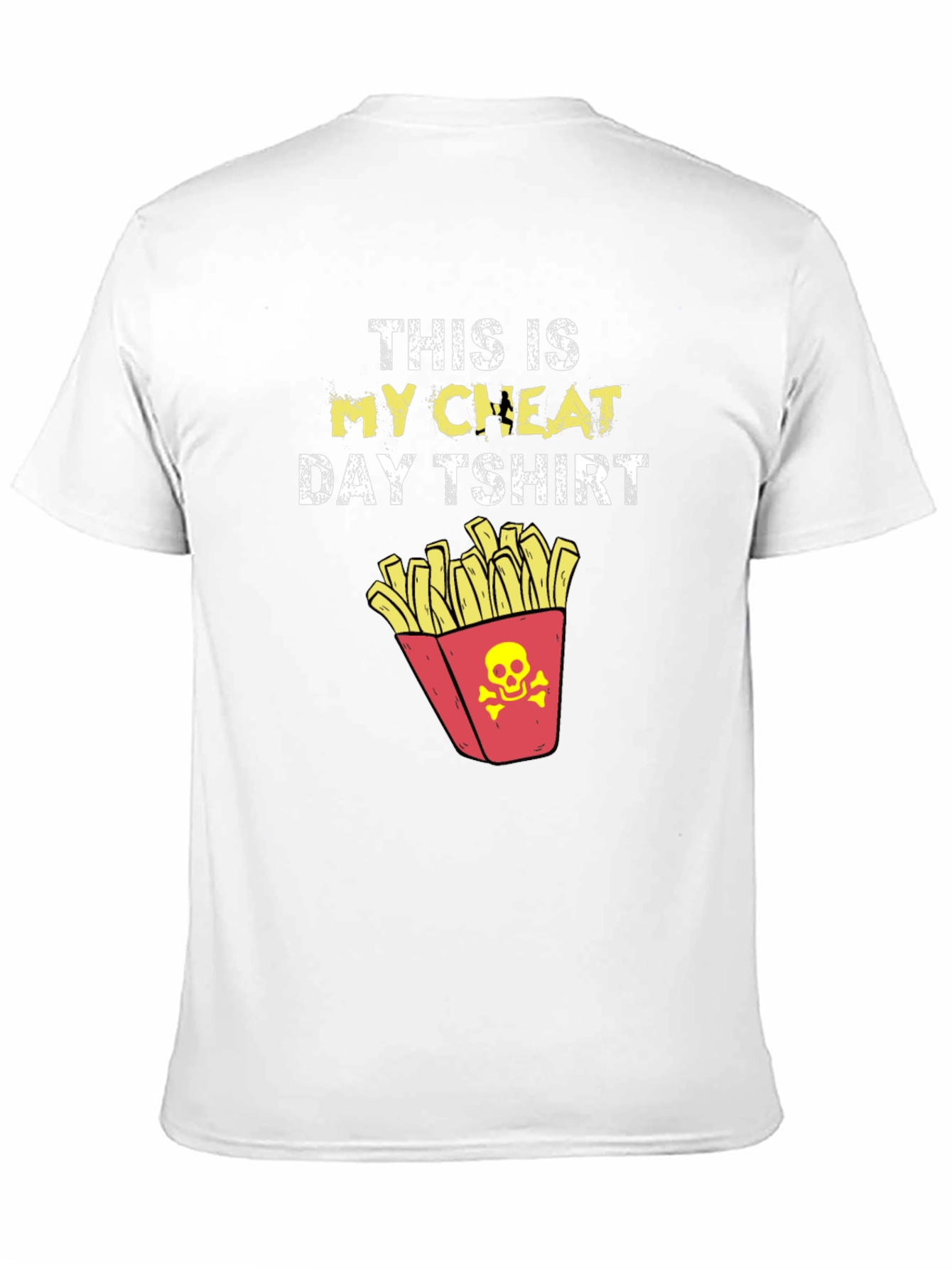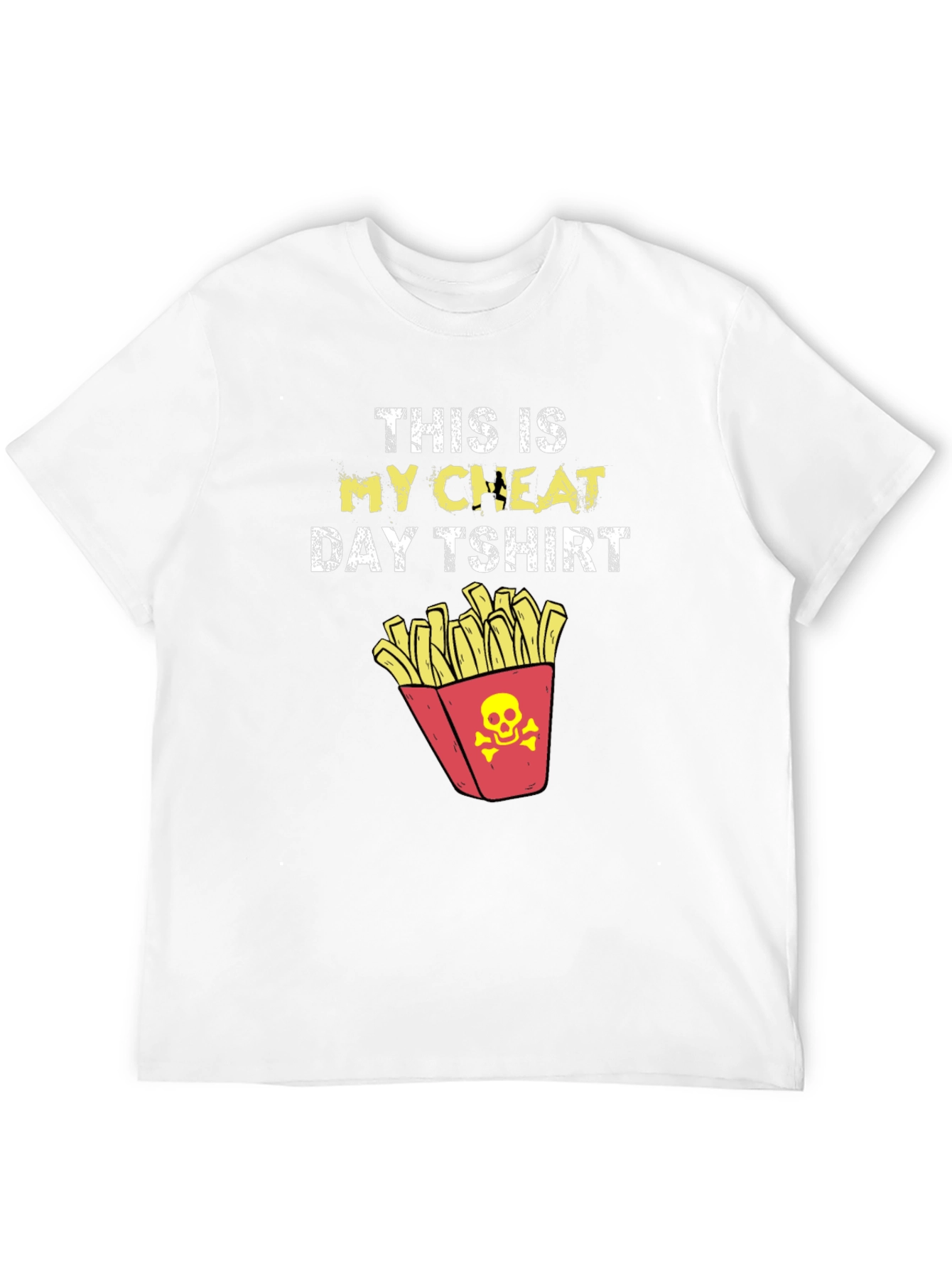 Indulge your cravings with this playful "This Is My Cheat Day T-Shirt." This black tee features bold white lettering that reads "THIS IS MY CHEAT DAY TSHIRT" complemented by the word "CHEAT" highlighted in yellow. Below the text, a fun graphic of a red carton of fries with a skull and crossbones adds a touch of rebellious humor. Perfect for foodies and fitness enthusiasts alike, this comfortable tee is made of a soft-looking material. It's ideal for casual outings, gym days, or simply relaxing and enjoying your favorite treat. Show off your love for cheat days in style!
