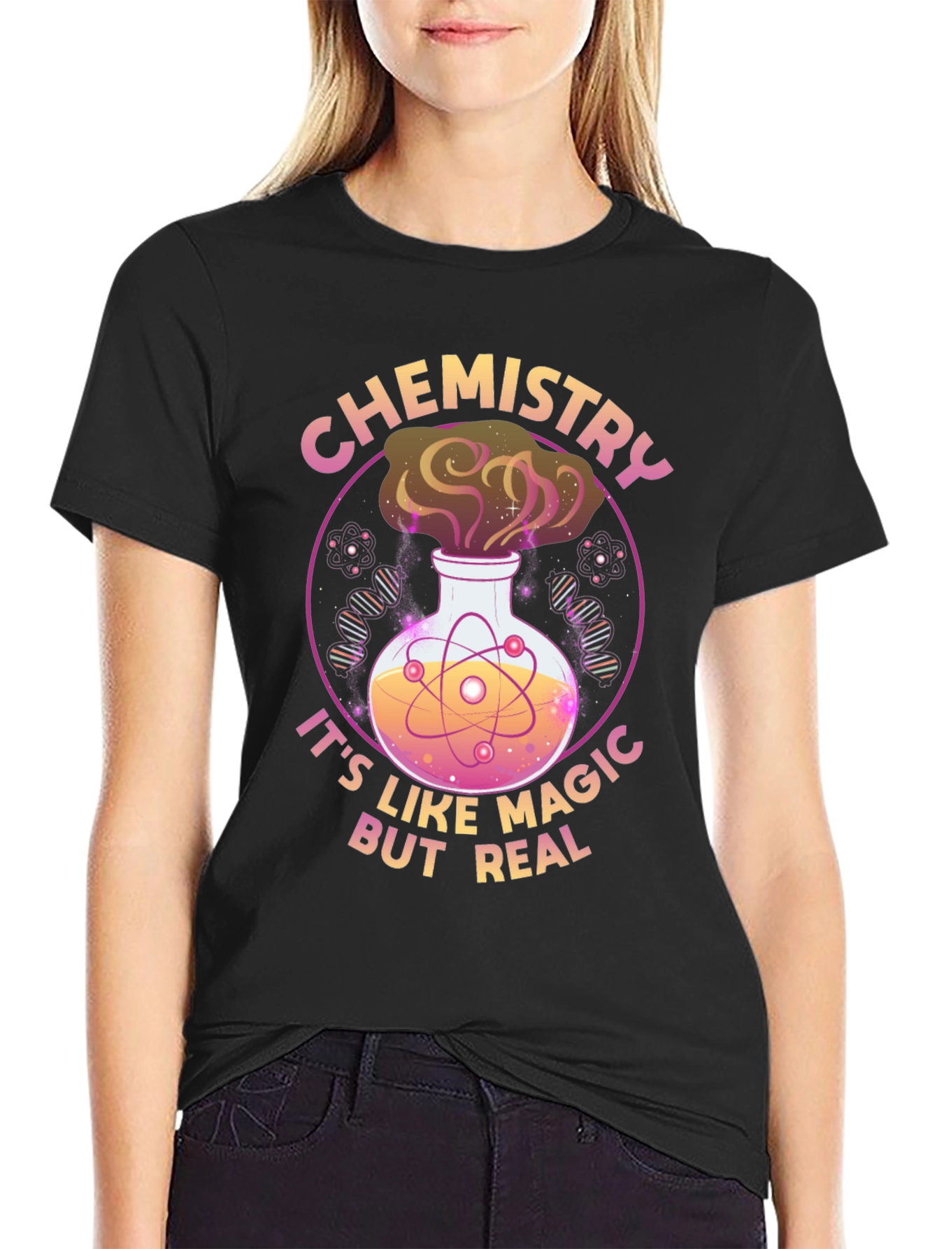 Show off your love for science with this eye-catching t-shirt. Featuring a vibrant design of a chemistry flask with bubbling contents and an atom illustration, encircled by the words "CHEMISTRY IT'S LIKE MAGIC BUT REAL". The design has bright pink and yellow and stands out against the t-shirt's solid black backdrop. The t-shirt appears to be made from soft, comfortable material, perfect for everyday wear. Ideal for students, teachers, or anyone passionate about chemistry and science in general, this shirt is a fun and unique way to express your interests.