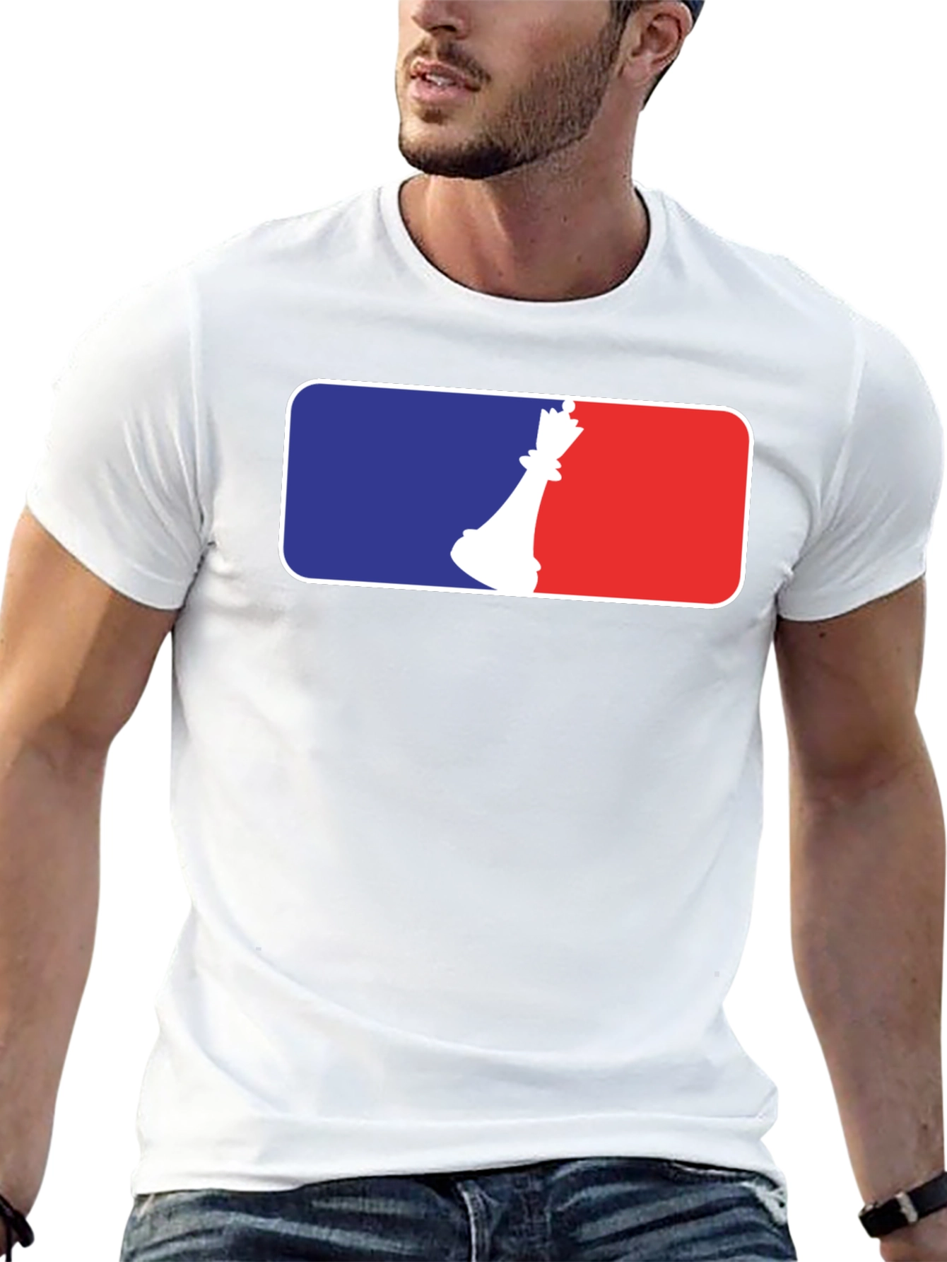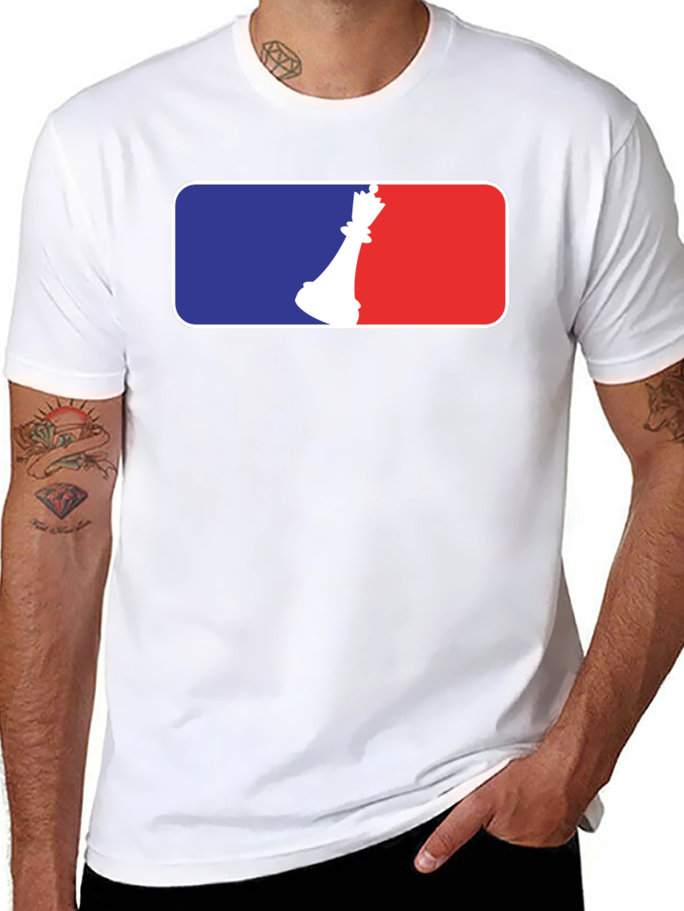 This black t-shirt features a unique chess-themed graphic. The design mimics a sports logo, with a white chess queen positioned against a split blue and red background. The shirt is made from a comfortable-looking fabric, ideal for casual wear. The short-sleeved design makes it suitable for warmer weather or layering. Show off your love for strategy games with this eye-catching tee, perfect for chess enthusiasts, gamers, and anyone who appreciates distinctive designs. A great conversation starter and a stylish addition to any wardrobe.