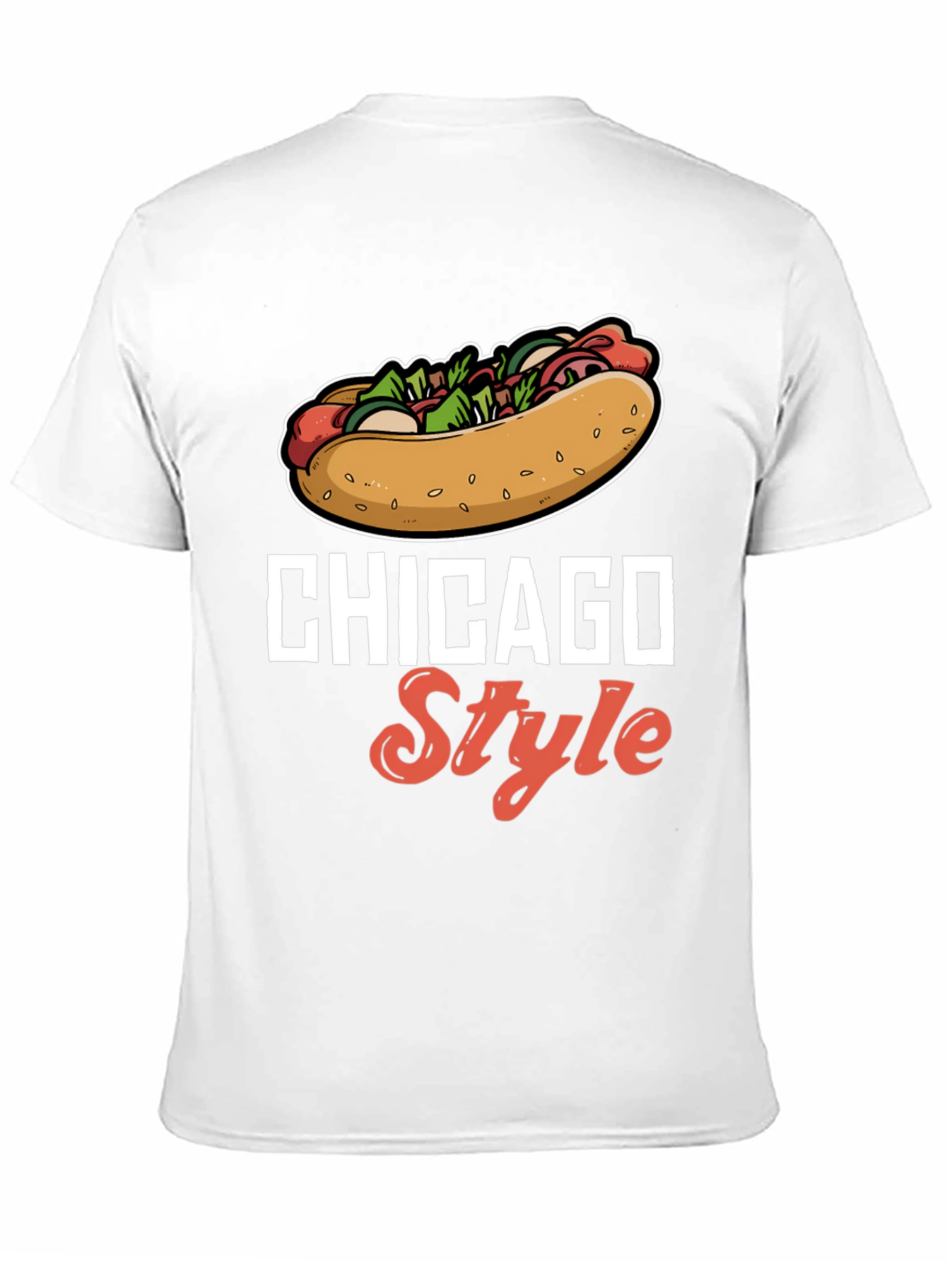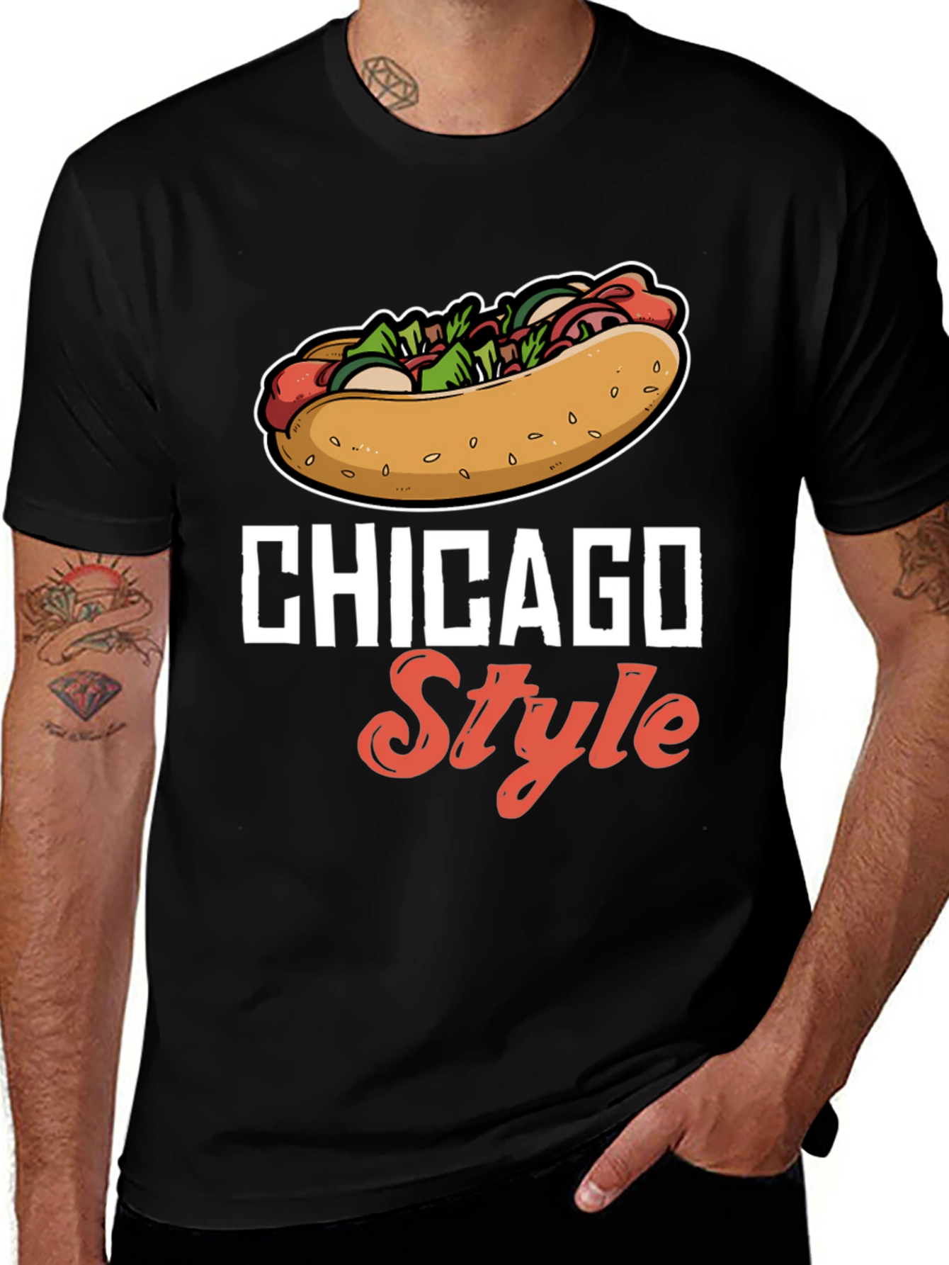 Show your love for the Windy City with this eye-catching graphic t-shirt. The shirt features a vibrant and detailed cartoon depiction of a Chicago-style hotdog above bold white block lettering that reads "CHICAGO," and the word "Style" in a cursive, red font. This design is printed on a classic black tee. Made from a comfortable fabric, this tee is perfect for casual wear, sporting events, or showing off your Chicago pride. This stylish piece will surely become a staple in your wardrobe. Grab yours today!